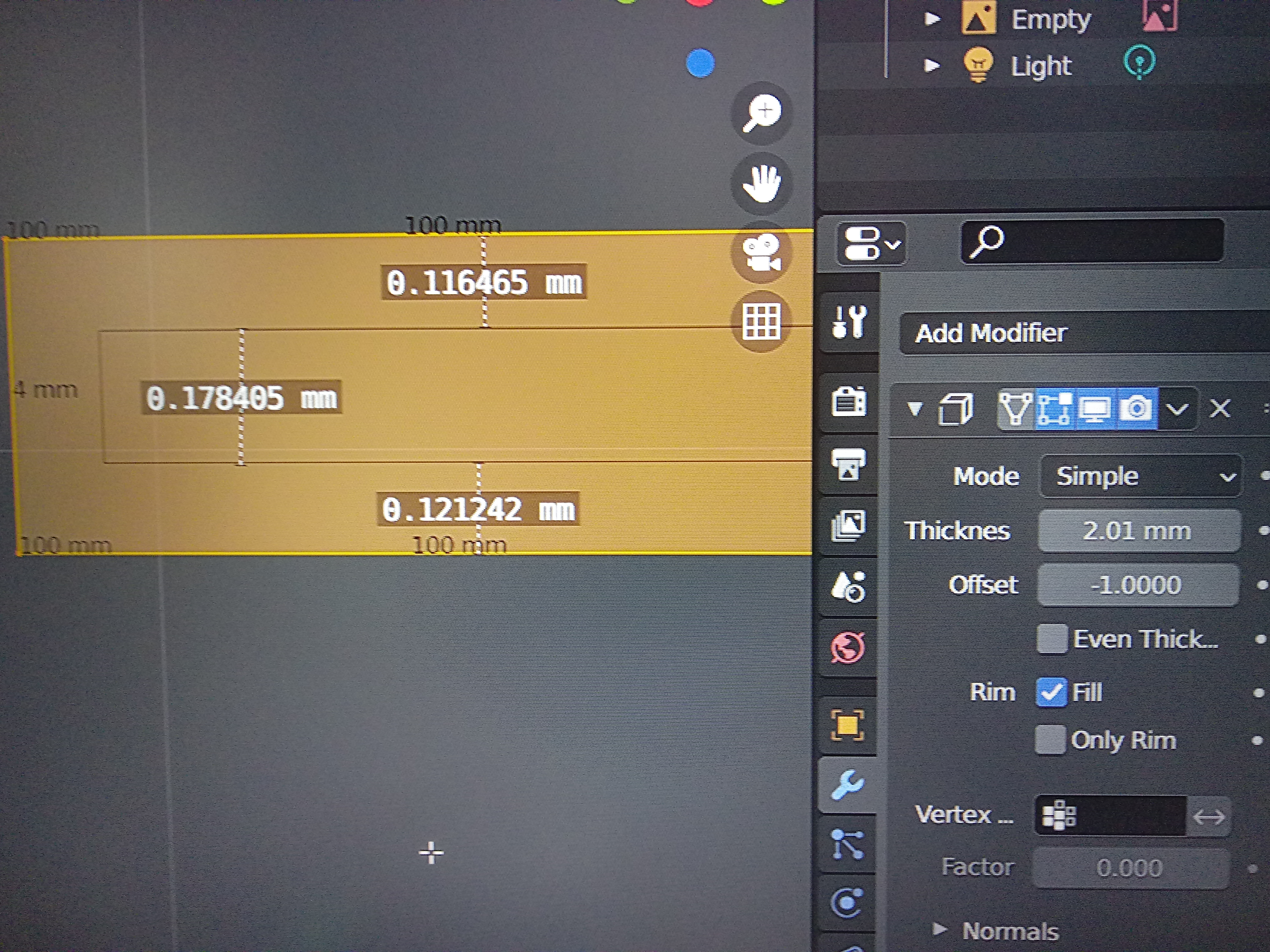 Aplico el Solidify a 2 milímetros en el Thicknes, pero aunque el ancho total de la pieza es de 4 milímetros, al medirlo con la herramienta de medir, me mide solo 0.12 milímetros más o menos cada parte.