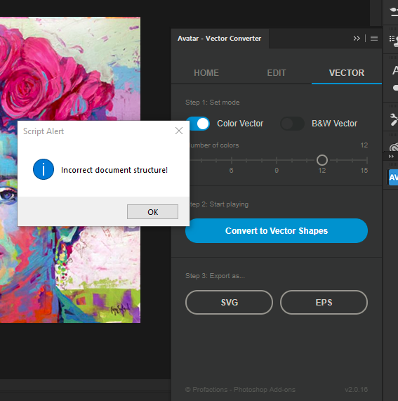 Buenas tardes amigos, tengo un error con el plugin AVATAR no me deja vectorizar las imágenes y aparece un error Photoshop CC 2019, esa acción ya me dejaba hacerla, y ya reinstalé el plugin y sigue igual.