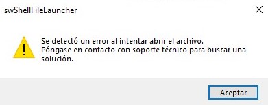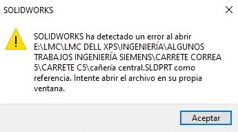 Si le hago caso la pieza que intento abrir aparte para ver si vuelve a aparecer me aparece un nuevo mensaje de SolidWorks de que se produjo un error al intentar abrir la pieza que me ponga en contacto con el soporte técnico para una solución.