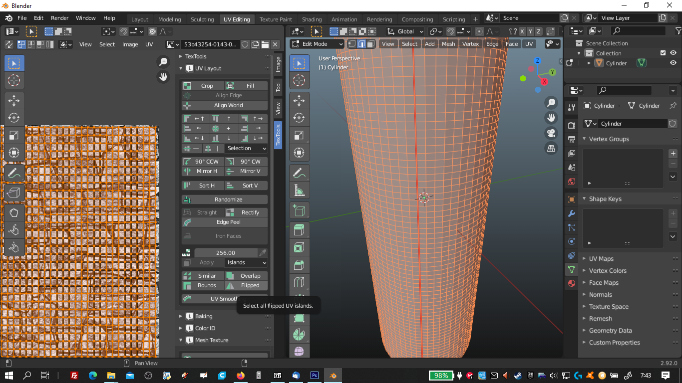 Buenos días. He estado trasteando con el panel UV del Blender y tras hacer una costura y realizar el Unwrap en la sección UV he importado la siguiente textura, ver adjuntos.