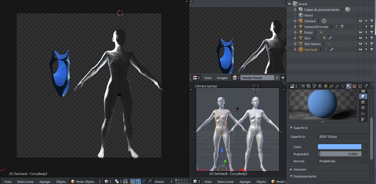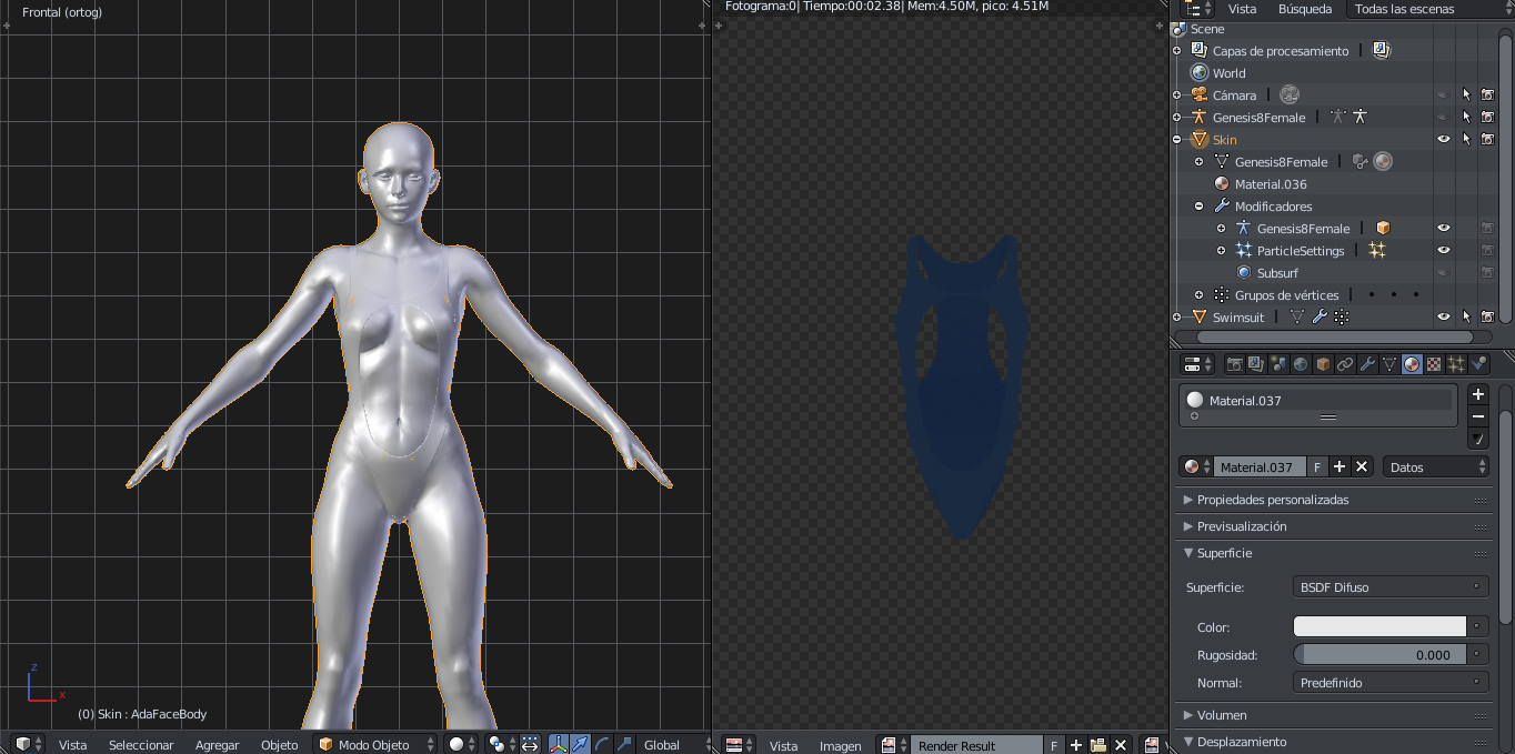 He importado el modelo de DAZ 3D a Blender, se ve en el espacio de modelado, pero no cuando renderizo. Me he fijado que está activada la casilla para el procesado del objeto y he revisado la parte de materiales y está todo en orden. Incluso he creado un nuevo material y sigue sin verse.