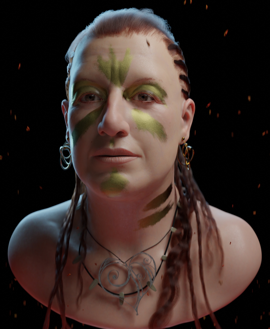 Tomé algunas fotografías y mientras la esculpía fui transformando su apariencia aunque tengo que decir que creo que logré el parecido, al no ser alguien famoso es complicado que se pueda evaluar, pero espero que la imagen (el personaje sigue en proceso) sea suficientemente creíble.