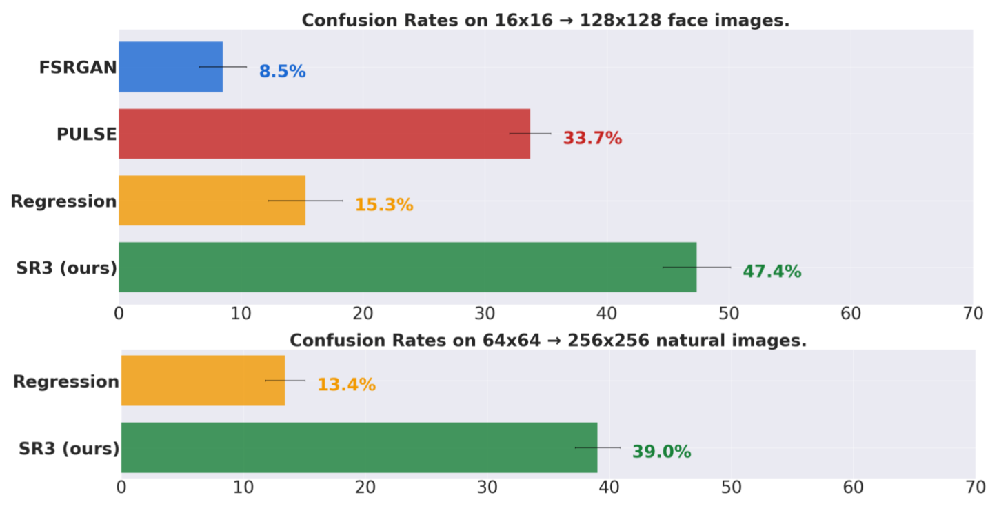 En comparación con los métodos SOTA GAN. SR3 logra una tasa de confusión cercana al 50 por ciento, lo que sugiere salidas fotorrealistas, mientras que los GAN no superan una tasa de confusión del 34 por ciento.