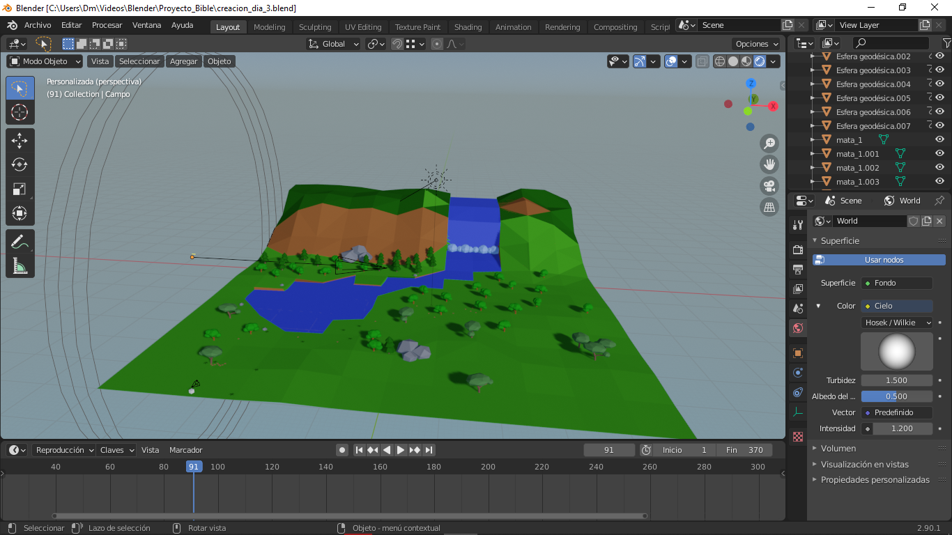 Hola, estoy realizando una escena sencilla en Low Poly de un paisaje. Tiene muchos árboles y me gustaría crear una pequeña animación.