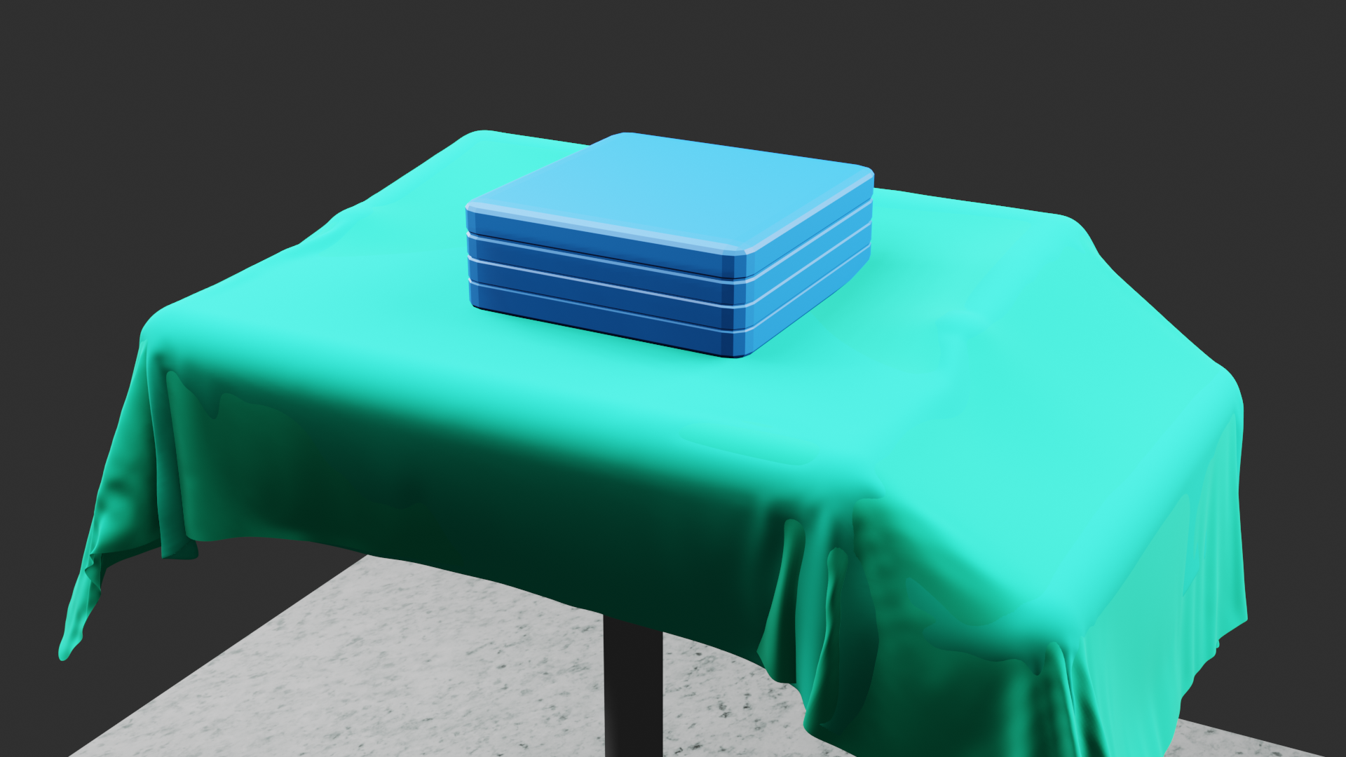 2) el segundo problema es que una vez desplegada la tela tiene que quedar como un mantel, es decir parecido a una tela y no algo rígido, pero al intentar darle física a la tela, rompe la animación anterior.