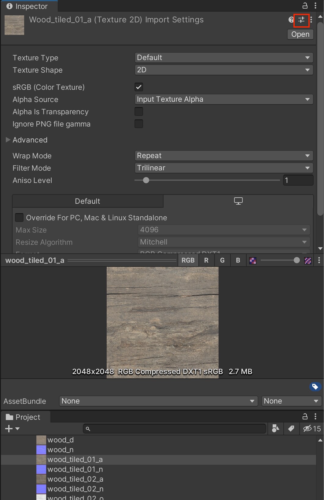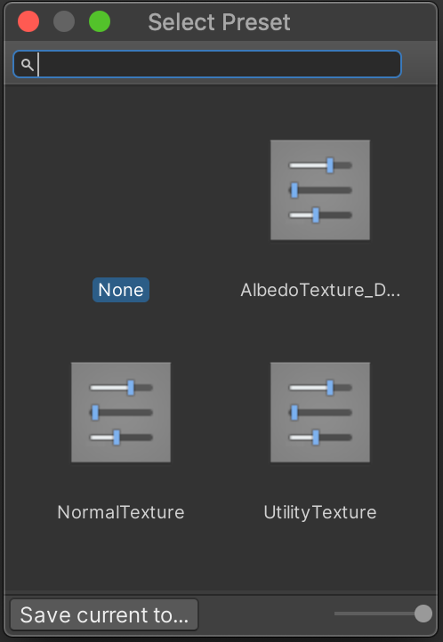 En este ejemplo, los ajustes preestablecidos contienen diferentes configuraciones de importación para texturas 2D según el uso (albedo, normal o utilidad).