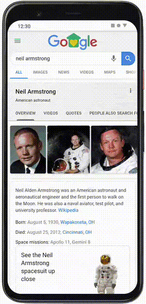 Cuando buscas en Google, puedes ver algunos resultados de búsqueda en 3D y realidad aumentada. Para ver los resultados en 3D e interactuar con ellos en realidad aumentada, necesitas un dispositivo Android o iOS moderno con Android 7 e iOS 11 o posteriores, respectivamente.