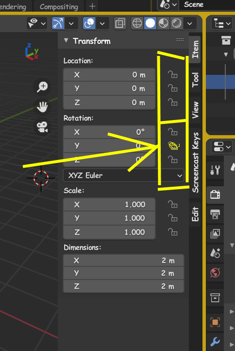 Solo me deja girar en el eje Z, espero que la captura de pantalla sirva, Cuando instalé Blender quise explorar un poco la aplicación y creo que presioné algo sin querer y desde ahí tuve el problema de la rotación.