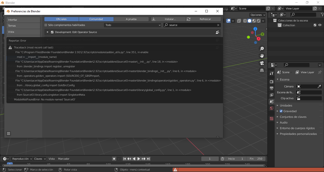 Pero a todo esto ¿Cuál es el problema? pues que una ves que voy a las configuraciones y trato de activar el instalador SourceIO me sale un error y no me deja darle el tic, en estas imágenes de captura se puede ver que al intentar activarlo sale un gran cuadro en donde no entiendo mucho cual es el error.