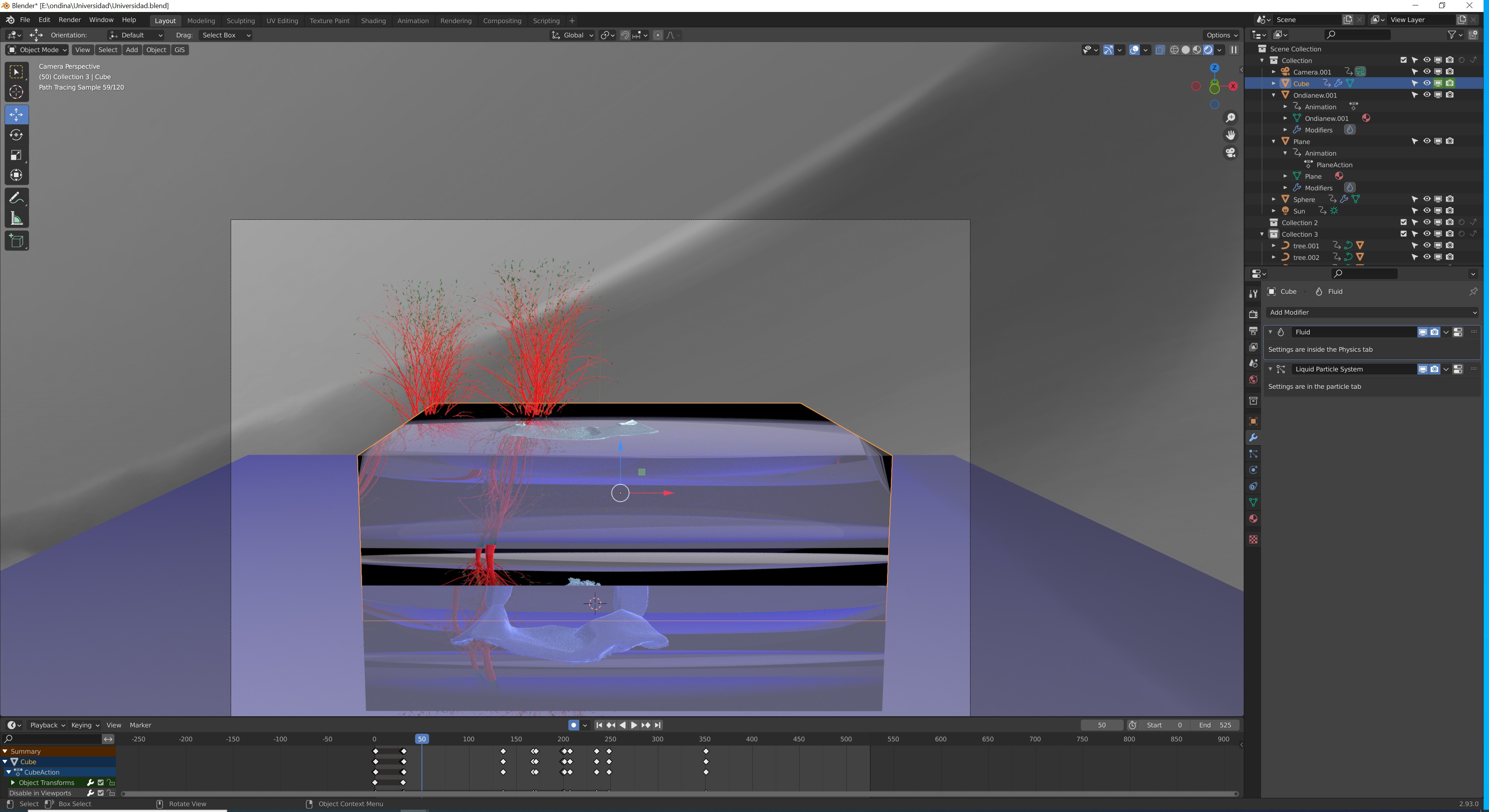 Aunque en el archivo original, en mi ordenador, el renderizado de fluidos funciona correctamente, al exportarlo a mi pendrive, cuando lo abro aparece el dominio como un bloque de colores.