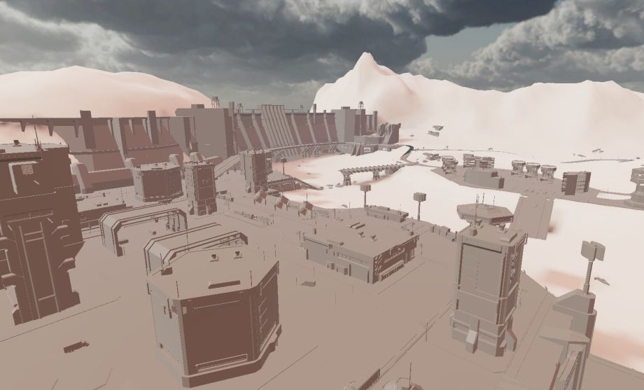 El prototipo de escena suele ser un modelo de colisión preliminar del nivel para proporcionar una idea de cómo es el paisaje, los puntos clave de interés del jugador, la cubierta disponible y los objetos principales.