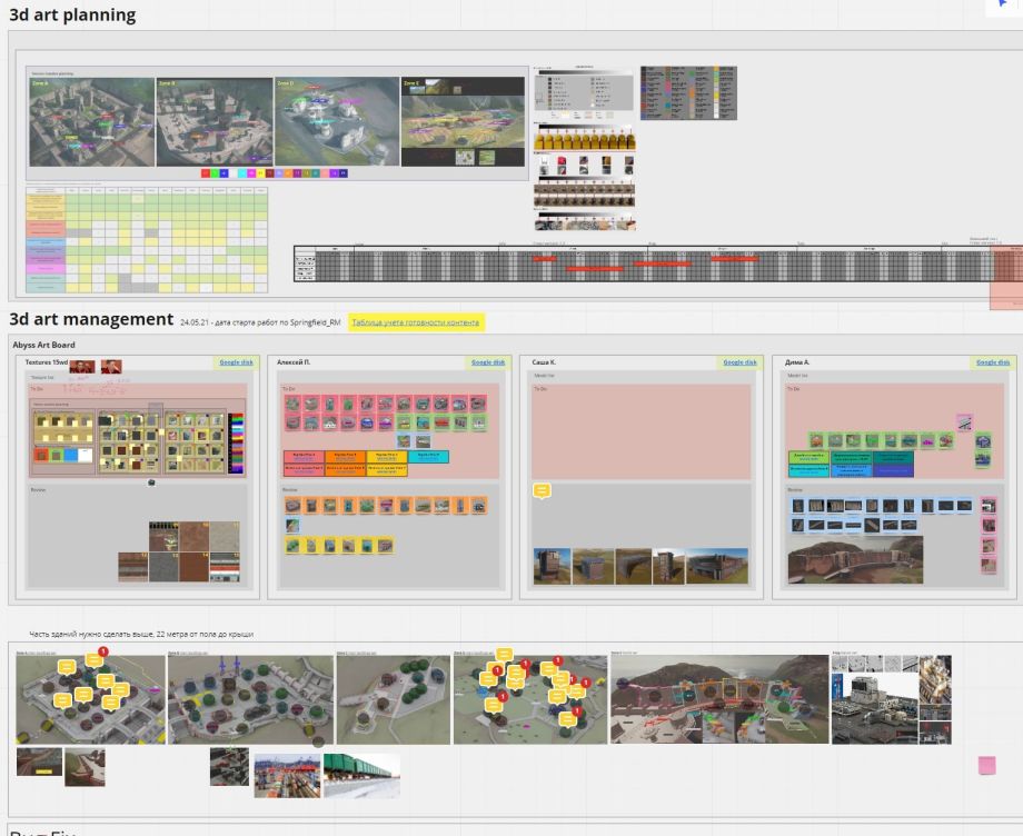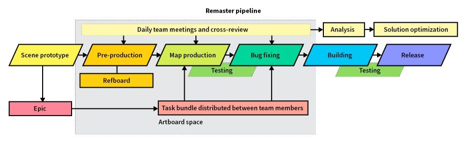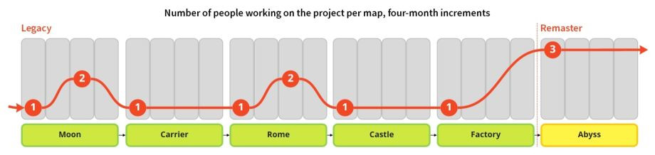 Tan pronto como se colocaron los rieles técnicos de la remasterización, tuvimos la tarea de hacer un nuevo mapa llamado el Abismo. Fue entonces cuando entendimos que los cambios técnicos también están trayendo inevitablemente cambios organizativos. La producción de un mapa por un artista ahora exigía 6-7 meses en lugar de los 4 anteriores. Necesitábamos un nuevo enfoque consciente de la organización de la producción y de nivelar nuestro trabajo en equipo: necesitábamos alejarnos de los ciclos de producción más largos hacia la racionalización de los procesos y su optimización.