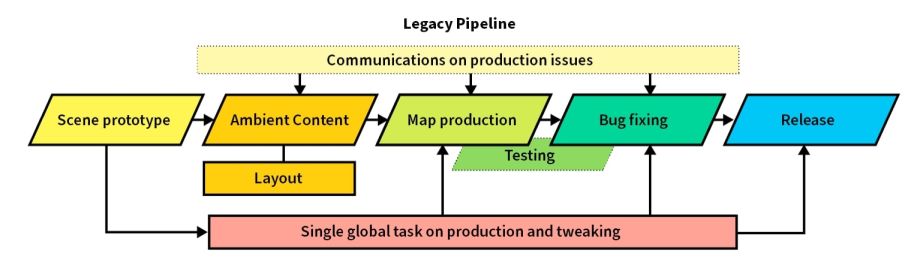 Nuestras prioridades en la actualización de mapas también cambiaron. Poner en marcha una remasterización es un proceso más complejo, técnicamente, ya que requiere integrar paquetes de activos y dividir escenas. La tubería no solo se volvió más compleja y la demanda cambió, sino que lanzó una reacción en cadena de producción con una cascada de tareas inseparables en el camino.