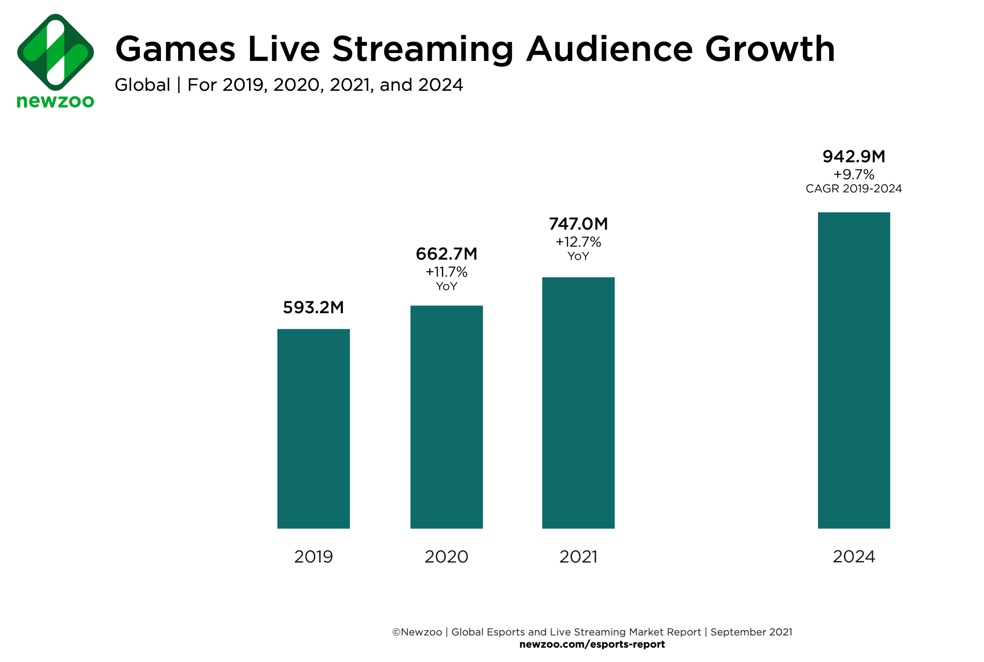Nos estamos acercando rápidamente a 1.000 millones de personas que ven contenido de juegos transmitido en vivo y en directo. 2021 marcó un año histórico para la transmisión en vivo, que rompió todos los récords de audiencia establecidos el año anterior. Una vez más, 2020 fue un año particularmente grande para el streaming debido a la pandemia. Pero la audiencia siguió creciendo un 12,7 por ciento interanual hasta los 747 millones de personas en 2021.