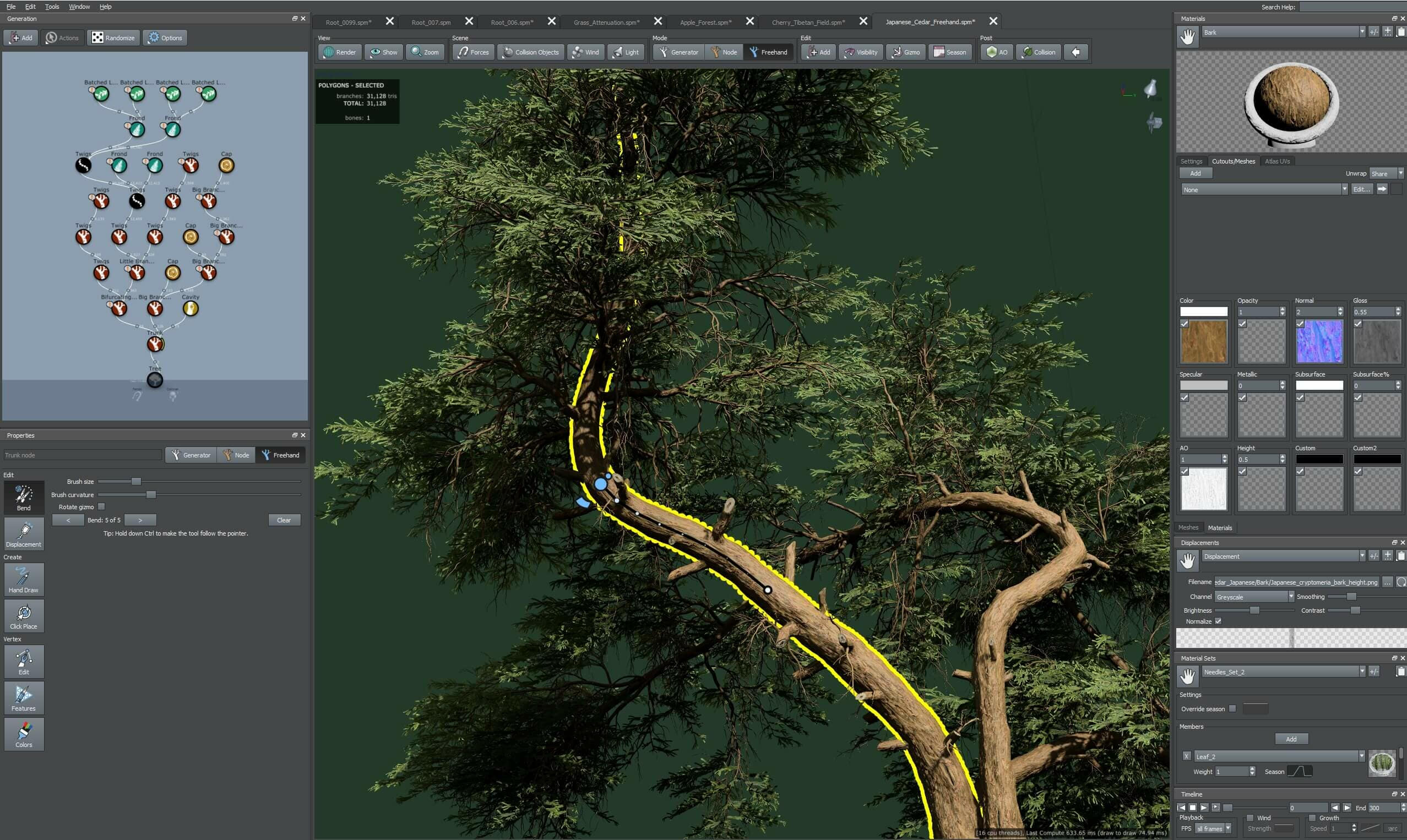 Los artistas también pueden usar el conjunto de herramientas para pintar el desplazamiento sobre troncos o ramas para crear características como burls y nudos, o pintar colores de vértices.