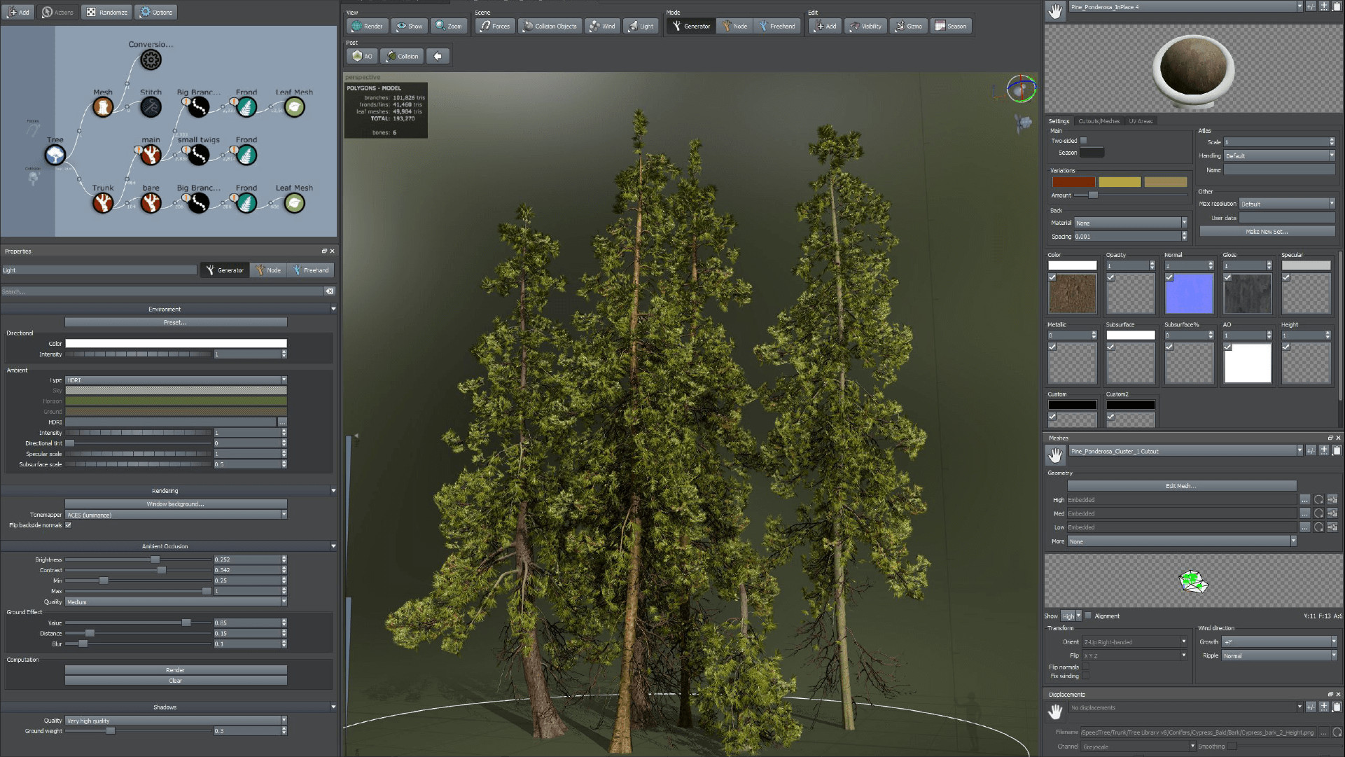 visuales desarrollado por primera vez hace más de dos décadas. SpeedTree genera árboles 3D texturizados y animados por el viento para el trabajo en tiempo real y fuera de línea. Para ello utiliza una combinación de generación de procedimientos y la edición manual.