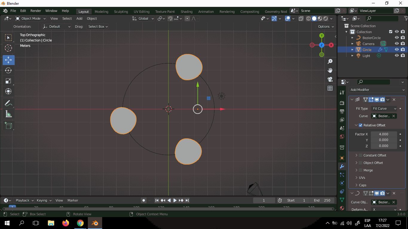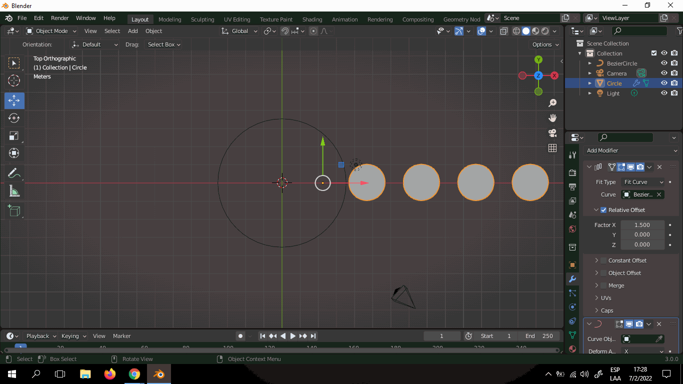 - Aplico el modificador curva y con el everdropper de curva objetivo le asigno la curva Bezier y obtengo la matriz circular, pero los círculos se deforman.