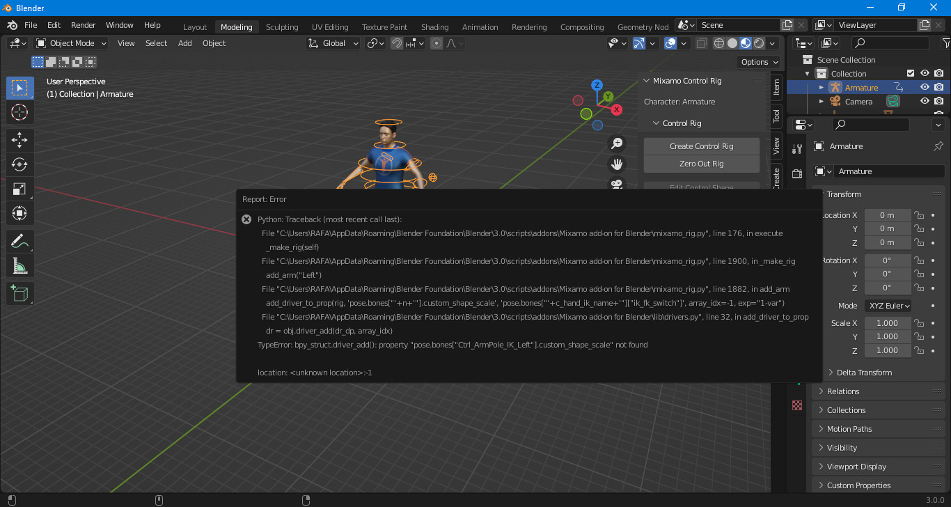 Lo importo a Blender y con el addon de Mixamo para Blender intento generar los controles de Rig.
