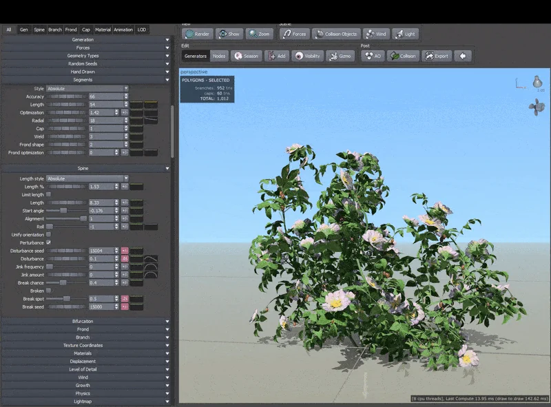 El siguiente paso es aplicar una malla de hojas a la planta y ajustar y ajustar la configuración principal en el menú generación. Finalmente, aplico características aleatorias adicionales y aumento la legibilidad de la malla en el menú deformación.