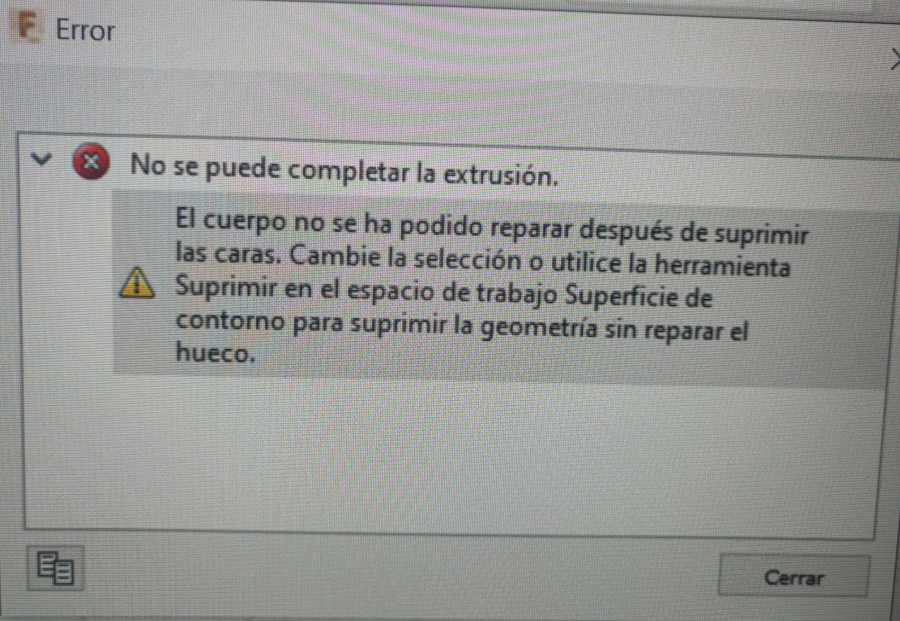 Este mensaje de error en Autodesk Fusion 360 puede ocurrir cuando intentas extruir una cara que tiene un agujero o una brecha en la geometría, lo que genera una superficie no válida. La extrusión no se puede completar porque Autodesk Fusion 360 no puede reparar la superficie.