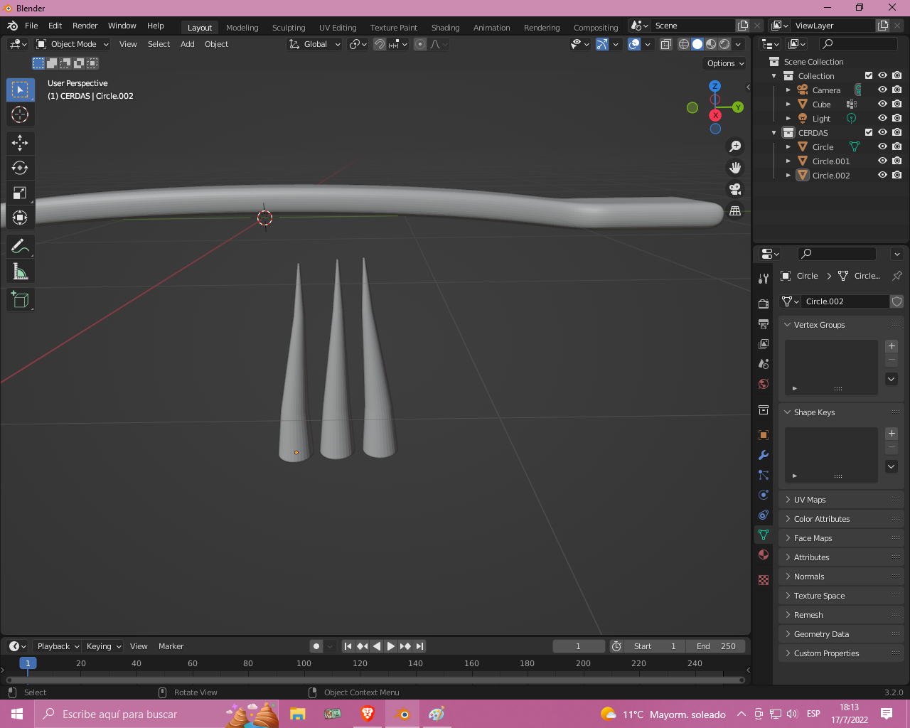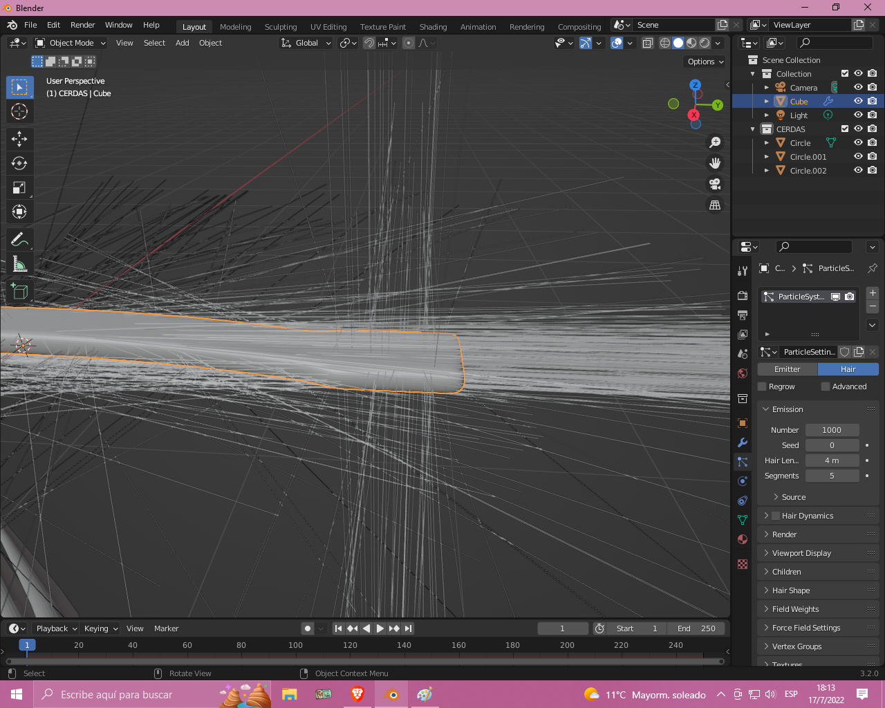 [Aquí comienza el problema, las "cerdas" no aparecen como anteriormente me aparecían los pelos, sino que aparecen horizontalmente, agrupadas una encima de la otra, la primera vez ni siquiera quedaban en la zona del Vertex Group que cree, ahora que lo volví a recrear para mostrarles quedan en la zona pero muy mal colocadas.