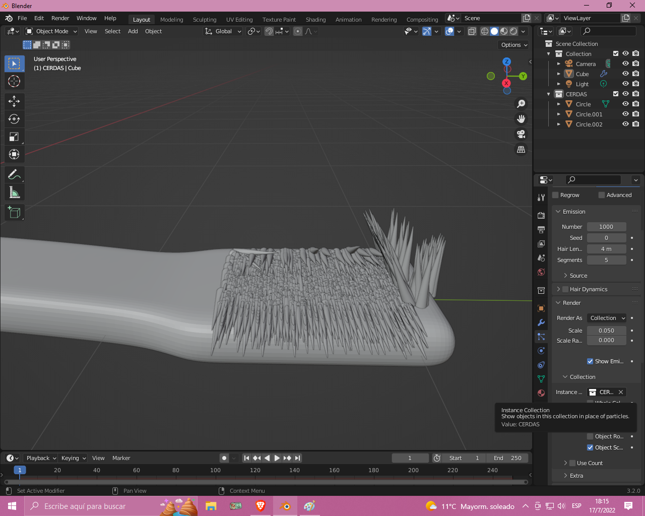 4. Agregué el sistema de partículas, las nombre "cerdas".