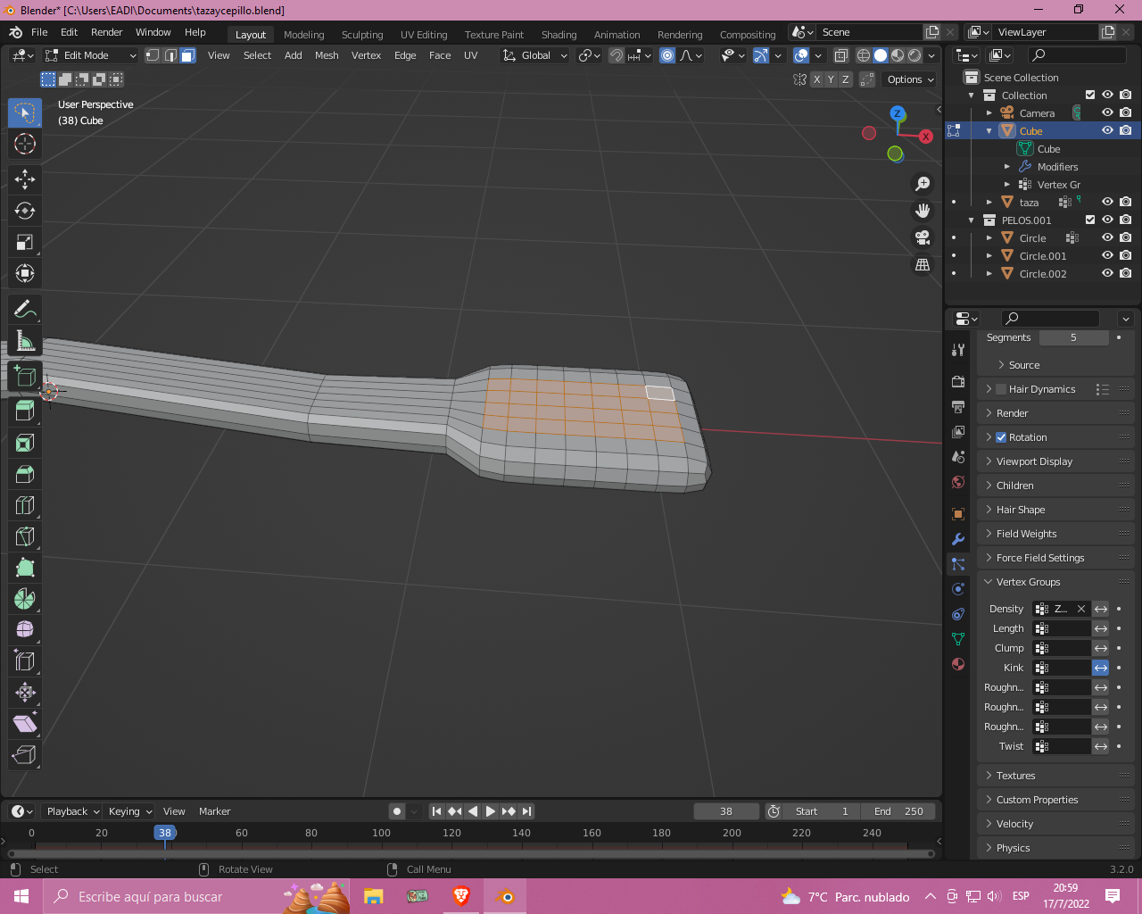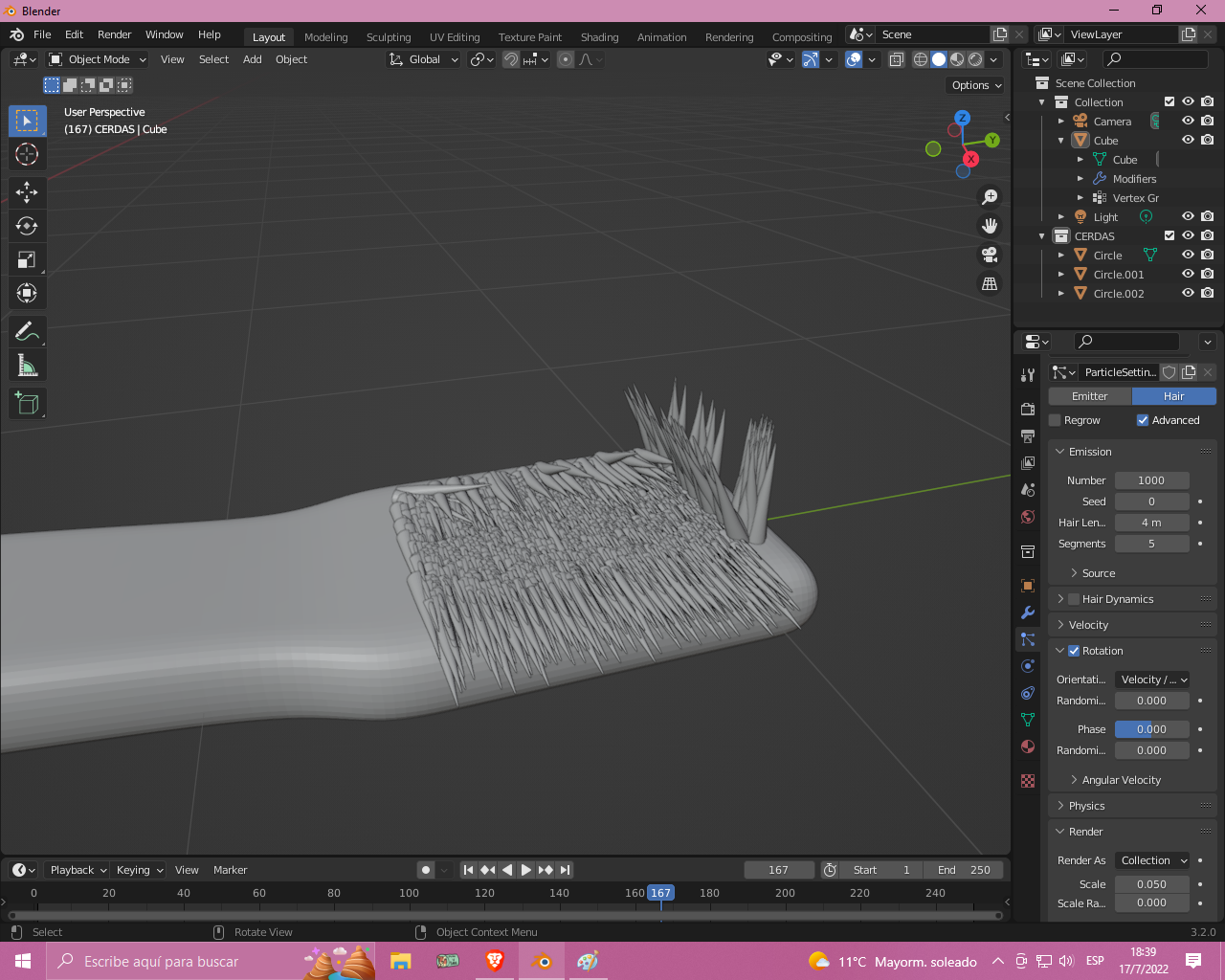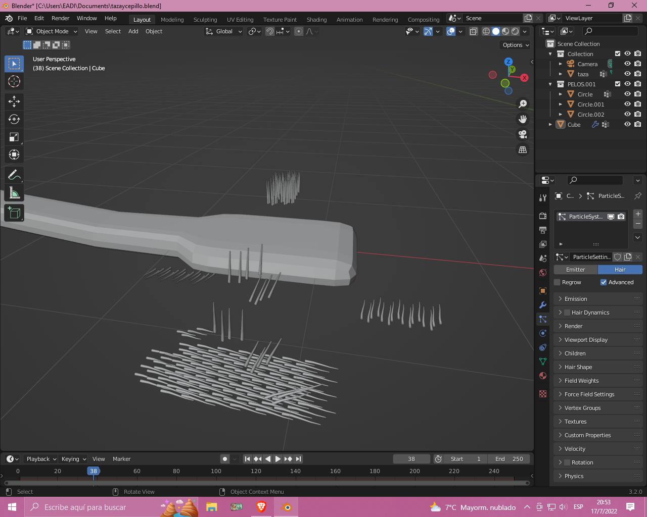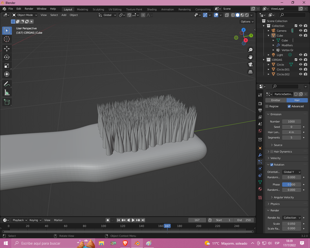3. Seleccioné todo el cepillo de dientes y fui al apartado "particle properties".