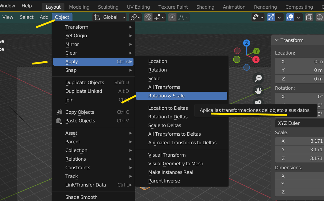 Esto se hace seleccionando el objeto en (Object Mode) y con el atajo de teclado Ctrl+A aplicamos la opción "Rotation & Scale" o lo podemos hacer desde Object > Apply > Rotation & Scale".