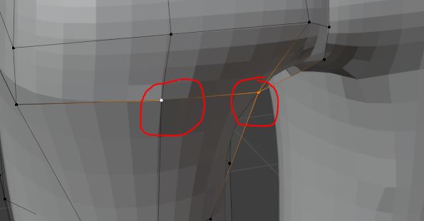 Hice el culo y piernas por separado, luego las uní con M vértice de culo con vértice de pierna. Luego puse modificador subdivisión y smooth y hay estos dos vértices que están agarrados a la insumisión del smooth y lo que provoca que el culo tenga una parte deforme cuadrada justo donde hice la unión.