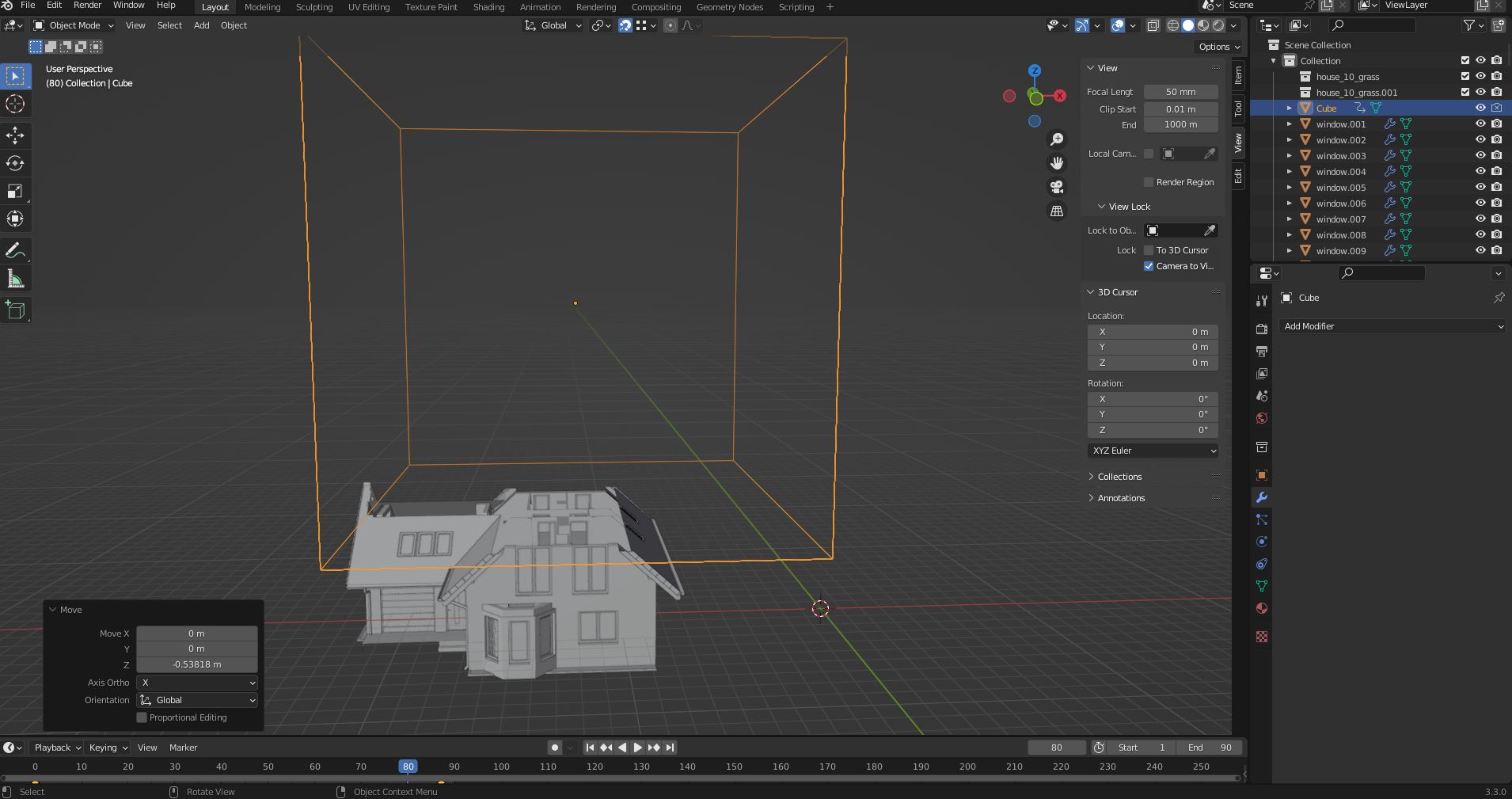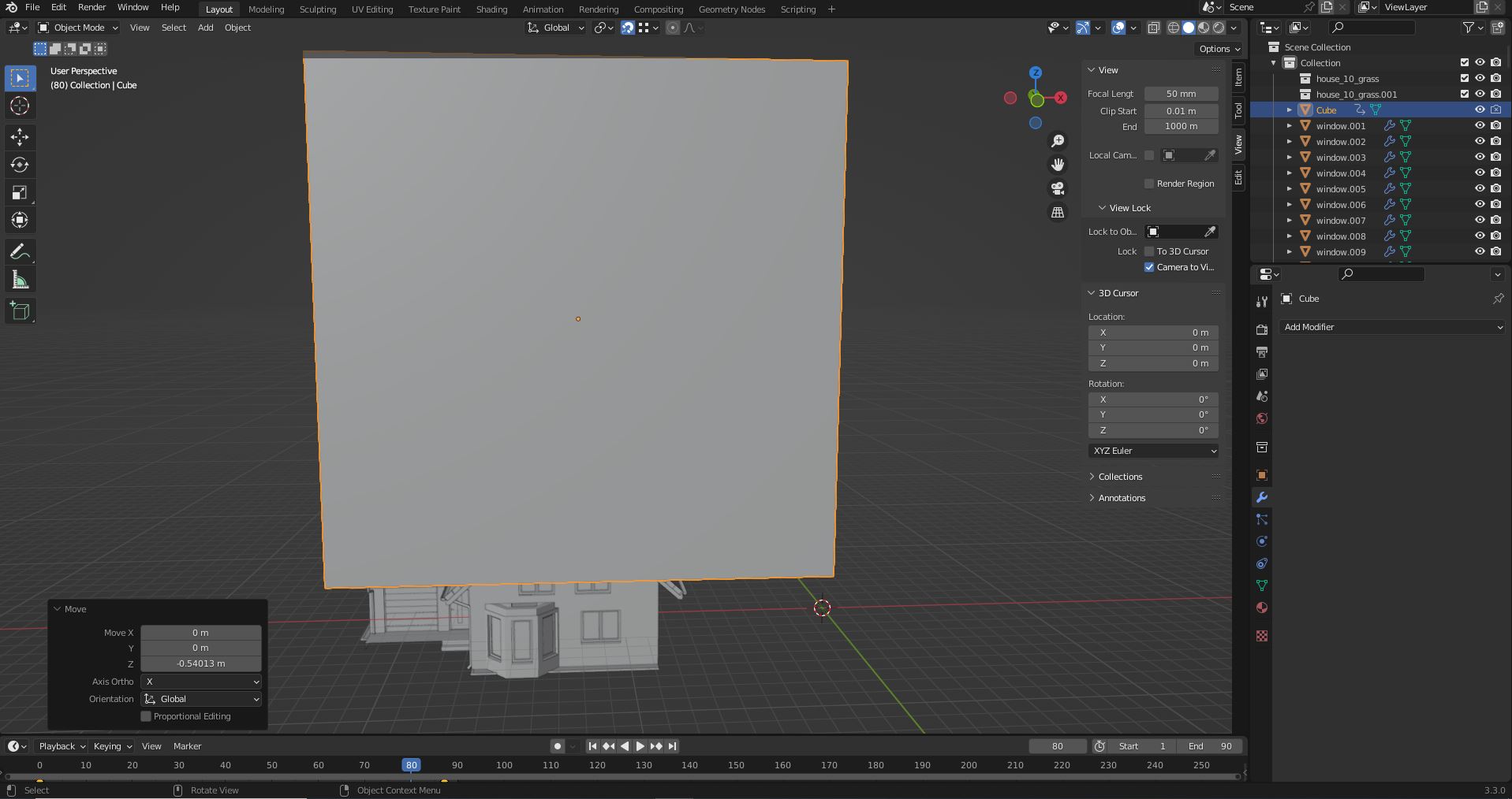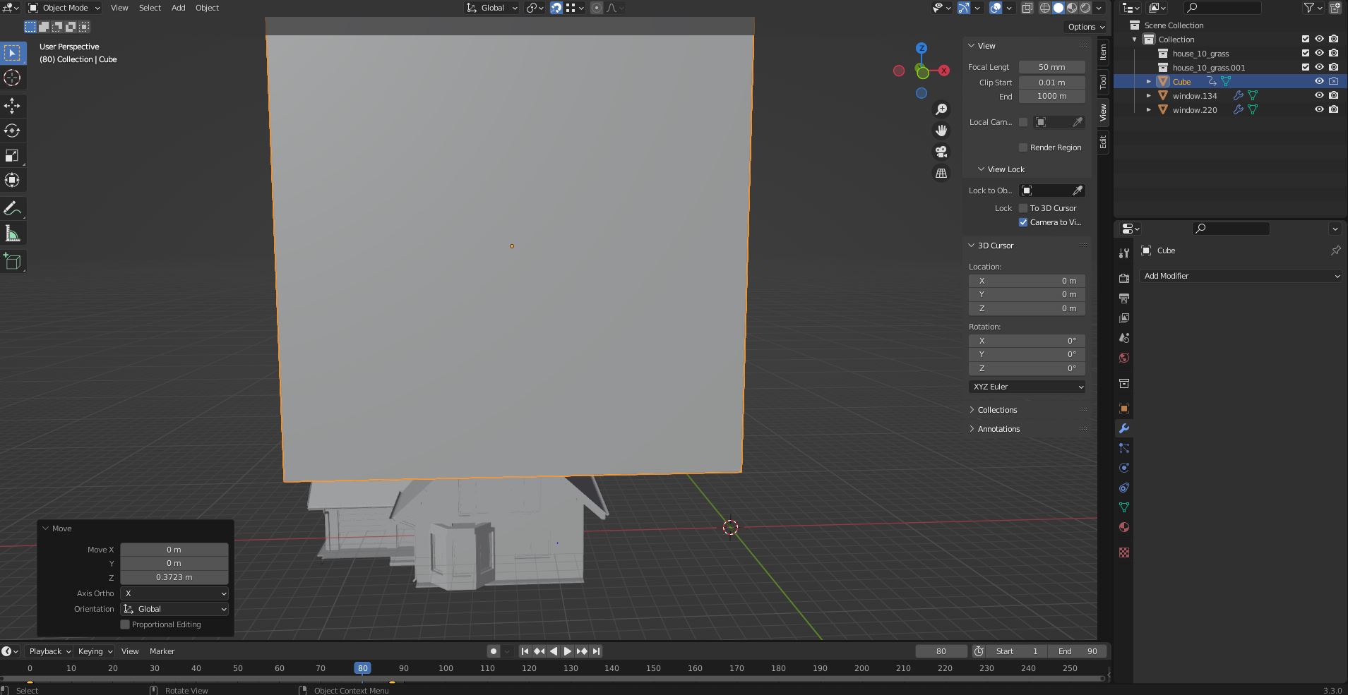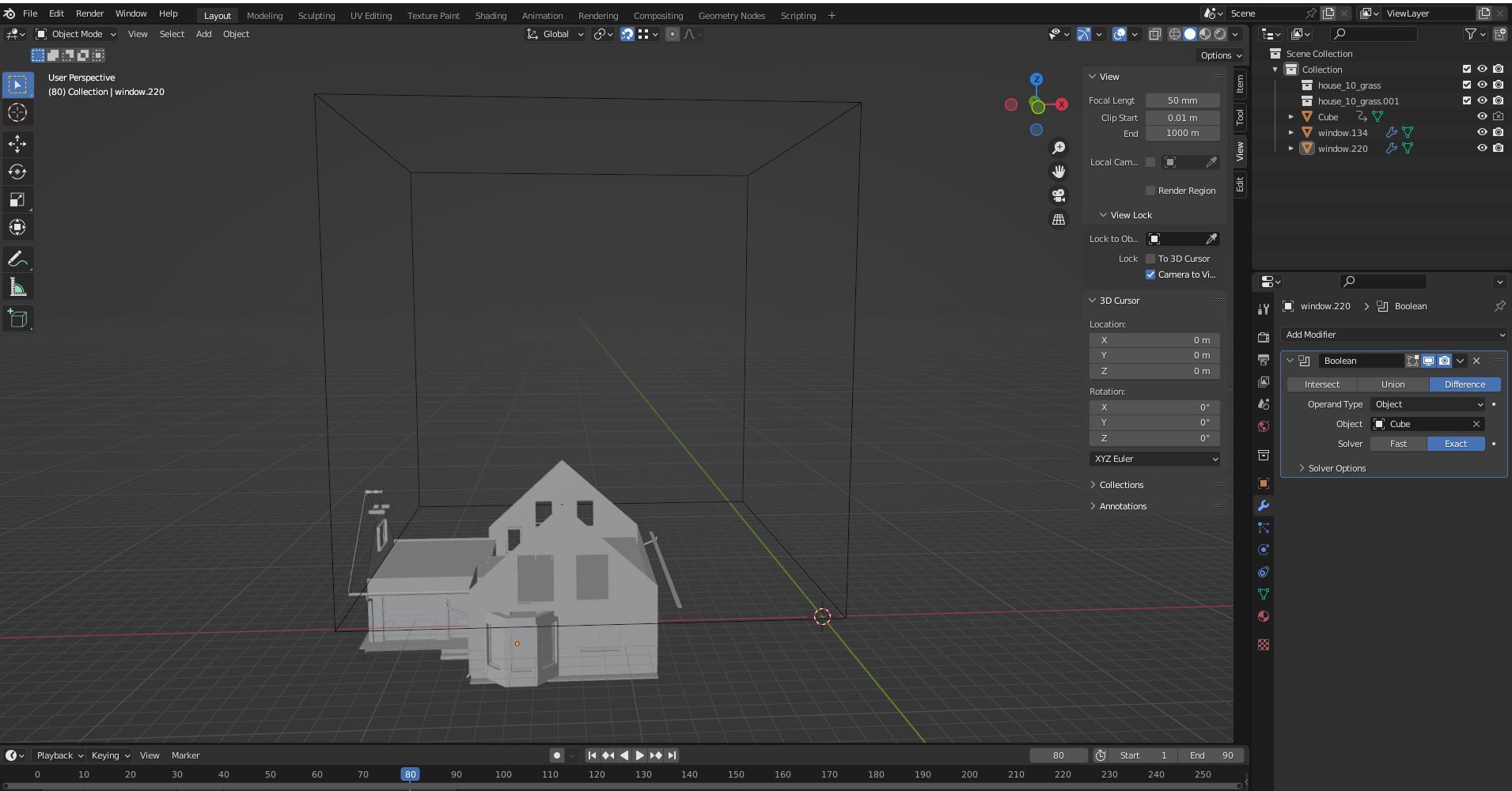 Buenas tardes, tengo un problema a la hora de aplicar boolean con cubo en modo wireframe, mi objetivo es hacer una animación donde la casa en este caso aparece y desaparece.