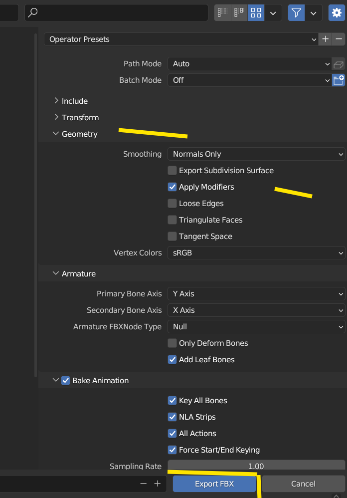 En teoría los modificadores se aplican al exportar en FBX (si lo tienes marcado, claro).Sí, el modificador de Armature. ¿Se lo aplico?