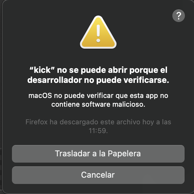 Haz clic en "Abrir de todas formas" al lado del mensaje "Kick no se puede abrir porque el desarrollador no puede verificarse".