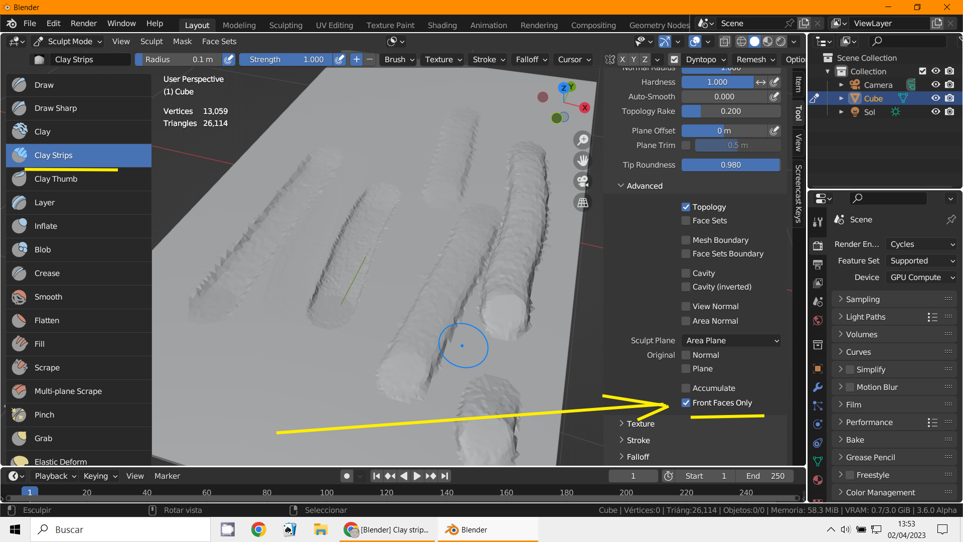 Blender 3.4.1 se deba a un ajuste en la herramienta Clay Strips. Para solucionarlo, te sugiero que pruebes lo siguiente: