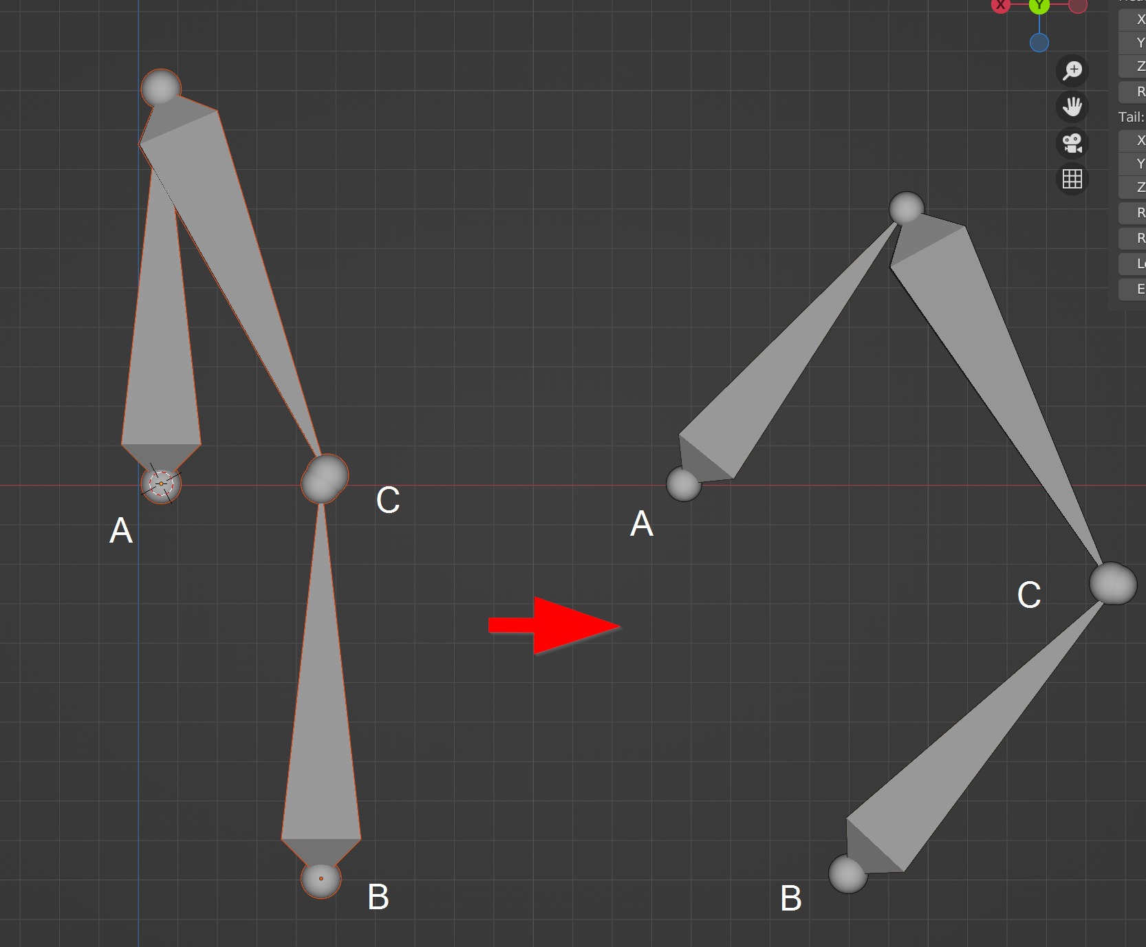 Tengo tres huesos (como se ve en la captura de pantalla). Hay dos puntos fijos (A y B). Solo debe haber un eje de rotación (Z). Mi objetivo es rotar solo el hueso B alrededor del eje Z y hacer que todos los demás huesos lo sigan, mientras que el punto A permanece fijo. En la captura de pantalla, la imagen de la izquierda muestra la posición original y la imagen de la derecha muestra la posición después de una rotación alrededor de B. Nota: los huesos A y B no necesariamente son paralelos.