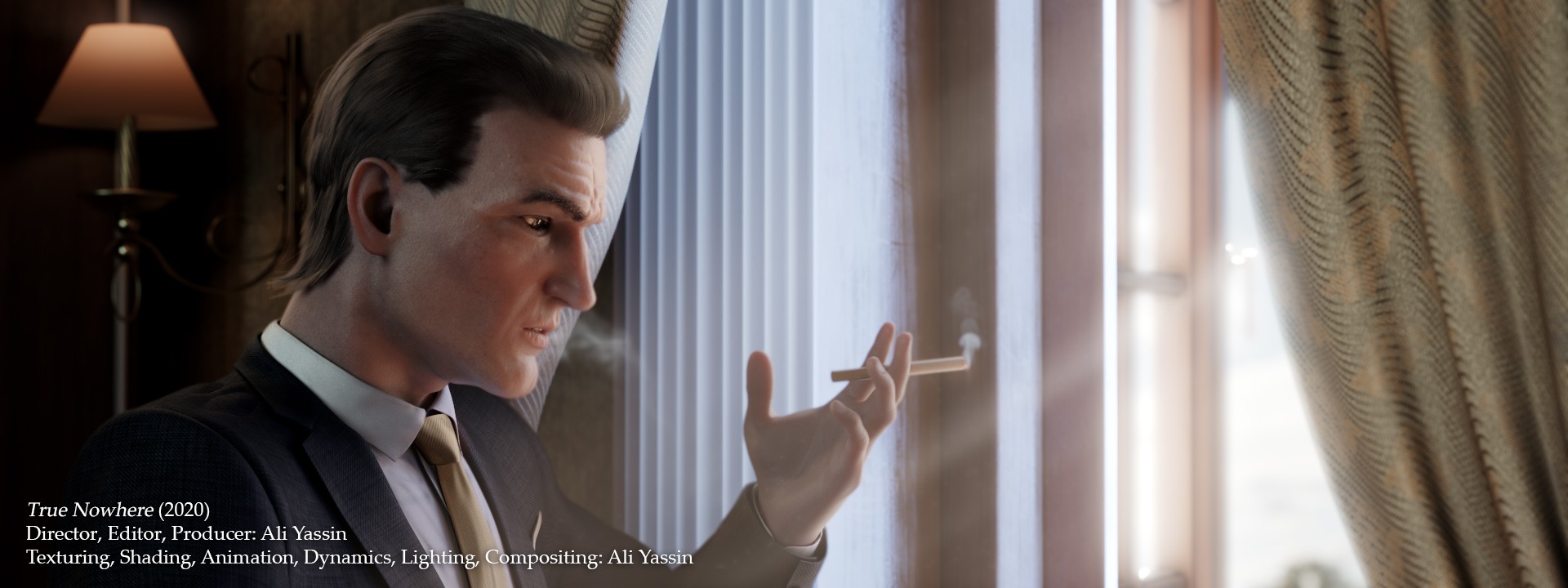 El autor trabajó en su película de tesis llamada "True Nowhere", en la que intentó crear una pieza de ambiente donde la narración se transmitiera principalmente a través de la iluminación. Para apoyar la narrativa, tuvo que realizar modelado y texturizado, animación de personajes y ajustar la música. La película trata sobre la adicción al trabajo y cómo puede afectar la vida de una persona, representada a través del deterioro del medio ambiente y el cambio dramático en la iluminación. El autor quería tomar una postura sobre esta idea y crear una obra de humor sobre el tipo de persona en la que no quiere convertirse.