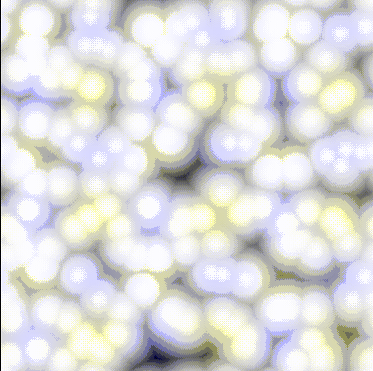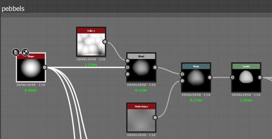 Usando una técnica simple pero efectiva, se resta una forma de paraboloide y una textura celular, y luego se deforma ligeramente para obtener un pequeño generador de piedra.