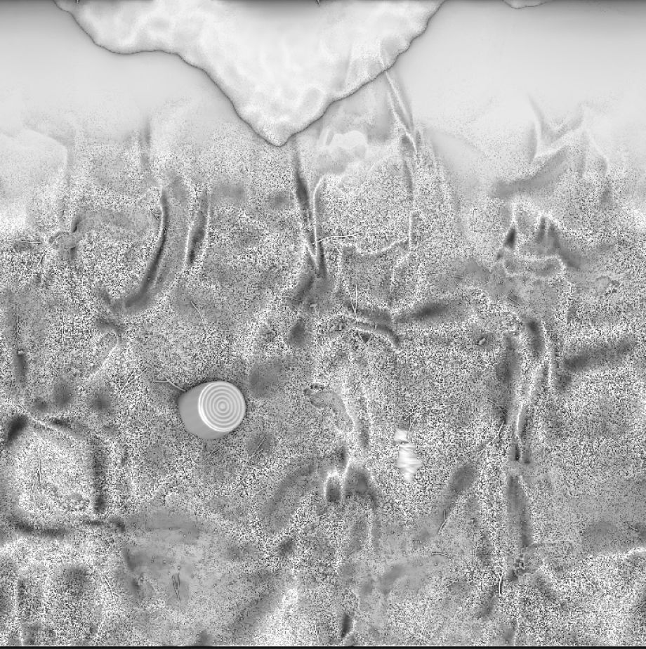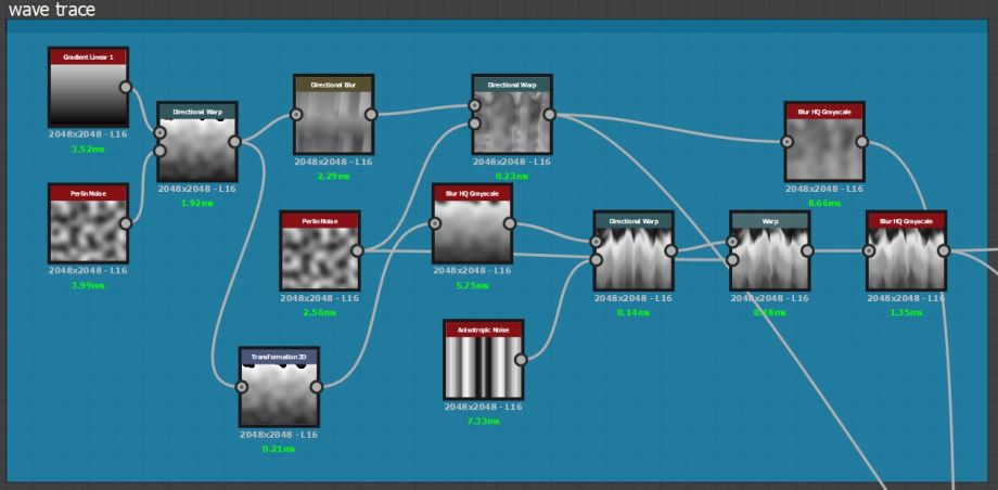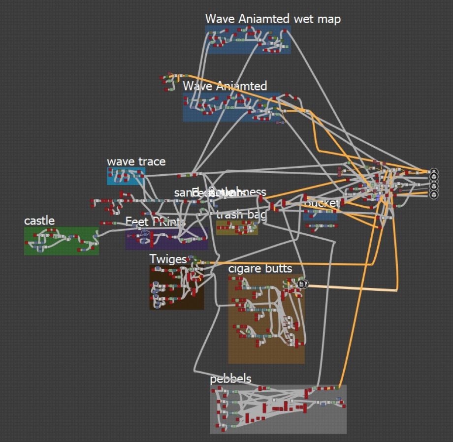 La arena afectada por las olas tiene un aspecto bastante diferente a la seca, ya que es húmeda, lisa y tiene un nivel de ruido más bajo con un ruido direccional visible debido al arrastre de las olas. Para lograr esto, es necesario usar un mapa de degradado y distorsionarlo con Perlin Noise. Luego, se distorsiona direccionalmente el resultado con Anisotropic Noise, se le agrega un poco de desenfoque y se lo distorsiona ligeramente. Las olas son las mismas que las de la orilla, pero con un nodo Transformar adjunto al Gradiente para controlar el desplazamiento. Al final, se le da algo de espesor usando Niveles y se mezcla un poco de ruido de celda para imitar la espuma.