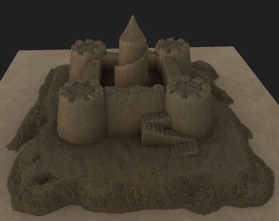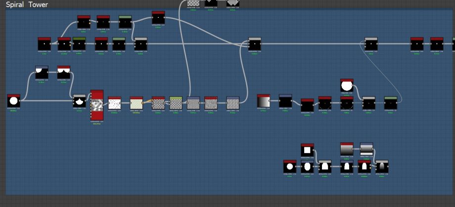 El castillo de arena se crea en un gráfico separado y se agrega más tarde, pero se le da forma utilizando principalmente nodos de forma y transformación y luego se bisela. Las escaleras en espiral son las más complejas; se crean agregando un gradiente y luego haciendo que sea redondo usando el nodo cartesiano a polar. Para crear las escaleras, solo se utiliza el nodo Quantize con un valor de alrededor de 64.