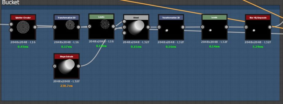 Para el balde, se crean anillos anidados simples para la parte inferior y se sustraen de una extrusión de forma con un ligero desenfoque.
