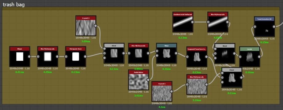 Esta es una bolsa de basura con una forma cuadrada que ha sido deformada varias veces utilizando ruido Perlin y Crystal. Además, se ha agregado un gradiente para crear altura.