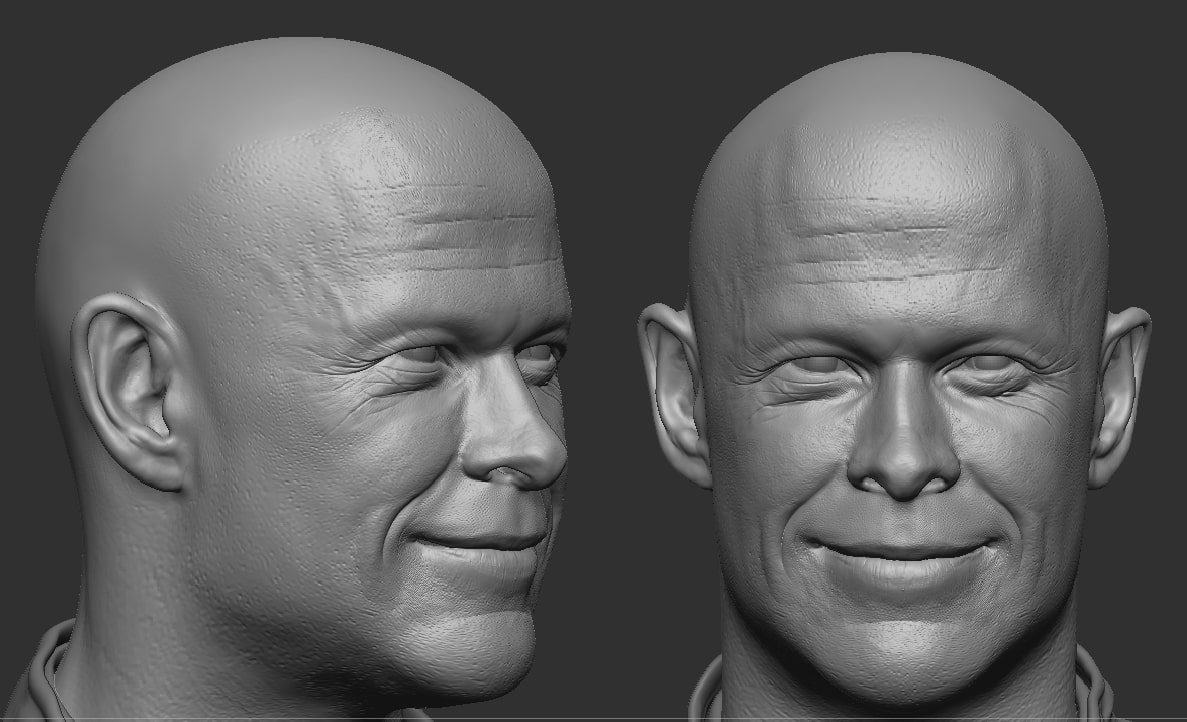Una vez que estuve satisfecho con las proporciones generales y las características esculpidas, como los ojos y los labios fruncidos, reproyecté mi Dynamesh en una malla con UV para mantener la resolución. A partir de ese punto, me enfoqué más en lograr el parecido con la persona en base a las fotos de referencia, y agregué detalles de la piel utilizando la geometría HD para obtener una mayor resolución en áreas específicas sin necesidad de subdividir excesivamente.