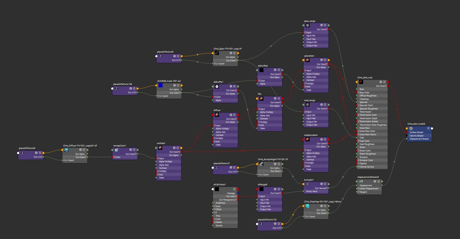 En cuanto a la representación, importé todo a Maya y utilicé Arnold para configurar los materiales de la piel, los ojos y el cabello. Mientras trabajaba en el aspecto de la piel, utilicé nodos de corrección de color para obtener más contraste o saturación según fuera necesario.