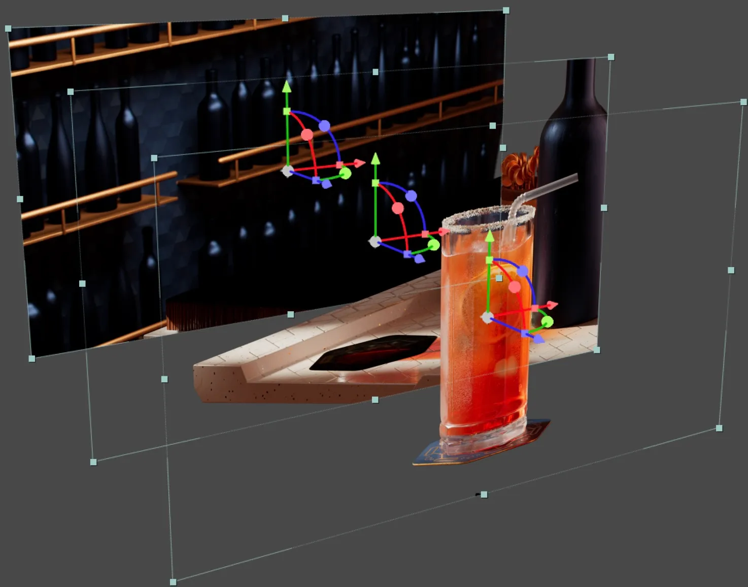 Además, si necesitaba hacer ajustes en la animación del cóctel, no era necesario volver a calcular toda la escena. Esta técnica de renderizado en capas también facilitó la etapa de composición, ya que pude agregar sombras y gráficos adicionales delante y detrás de los vasos de forma más eficiente.