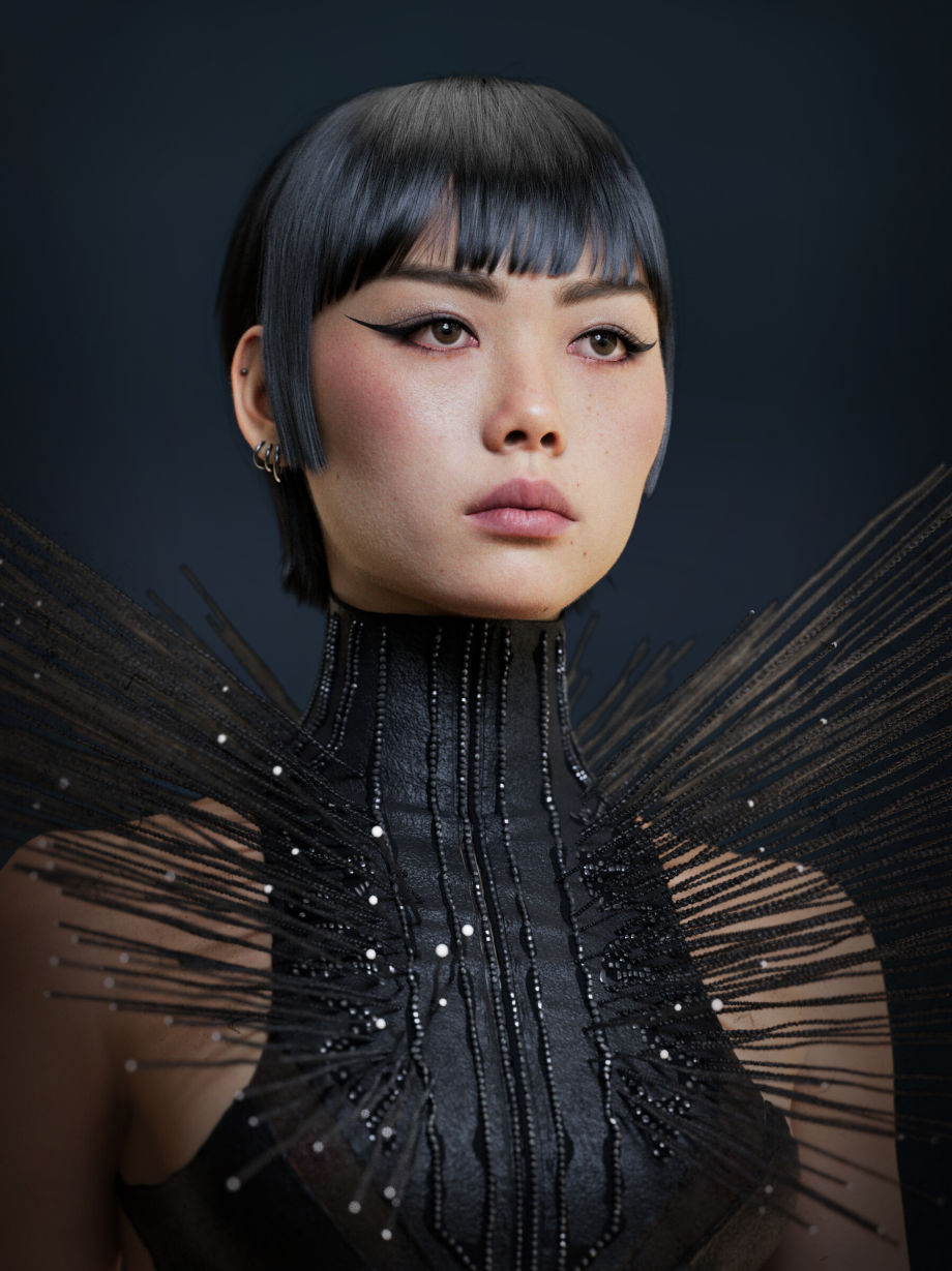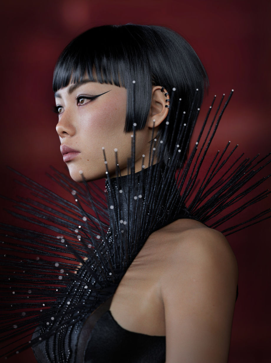 Este impresionante modelo forma parte de la colección OBSIDIAN LIGHT y será utilizado para diseñar innovadores atuendos, peinados y maquillaje. Esta colección representa el preludio de una línea escultórica de ropa y accesorios para mujeres, impulsada por un espíritu rebelde y como una declaración de empoderamiento del cuerpo humano.