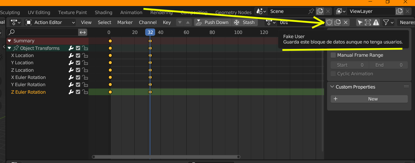 Lo de guardar como Fake User se hace cuando tienes diferentes animaciones por separado, para que no se pierda ninguna.