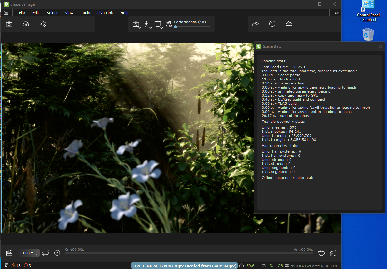 Como puede verse abajo, en el cuadro de estadísticas de Vantage, la escena posee más de 3 mil trescientos millones de polígonos y su reconstrucción es muy rápida, incluso en una placa modesta como la RTX 3070. El uso de VRAM es solo 3.4 gigas y la navegación se mantiene siempre a 60 fps.