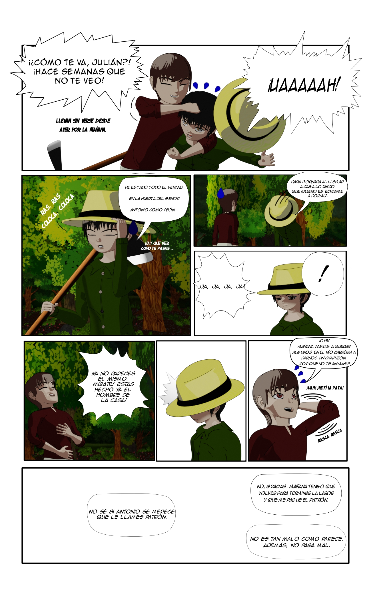 Por ejemplo, en la viñeta donde el personaje dice: ¡Oye! Mañana vamos a quedar algunos en el río Cabréira a darnos un chapuzón. ¿Por qué no te animas?