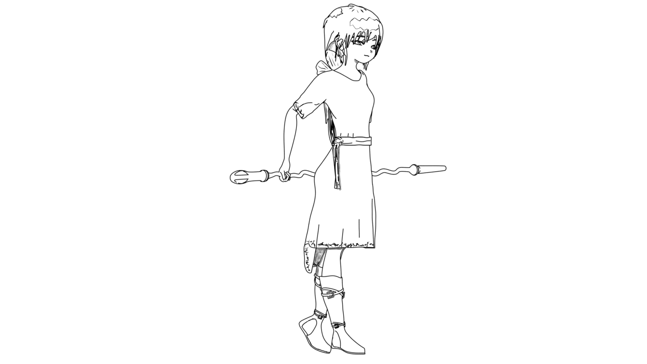 El contorno es de Blender, luego tuve que arreglar algunos desperfectos en la manga y acabados en freestyle porque en el rénder no quedaba bien; los dibujos de la falda y bocamangas y añadí unas tramas básicas para las sombras y el brillo del pelo.