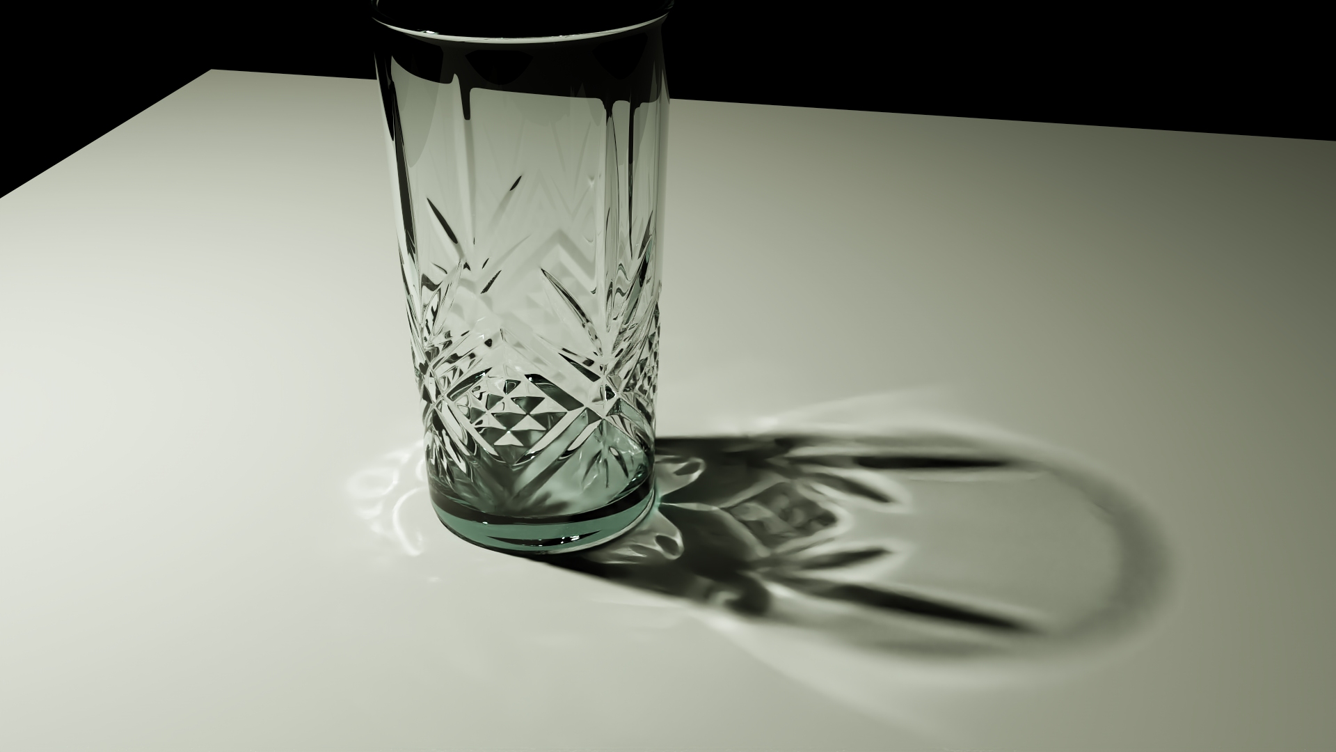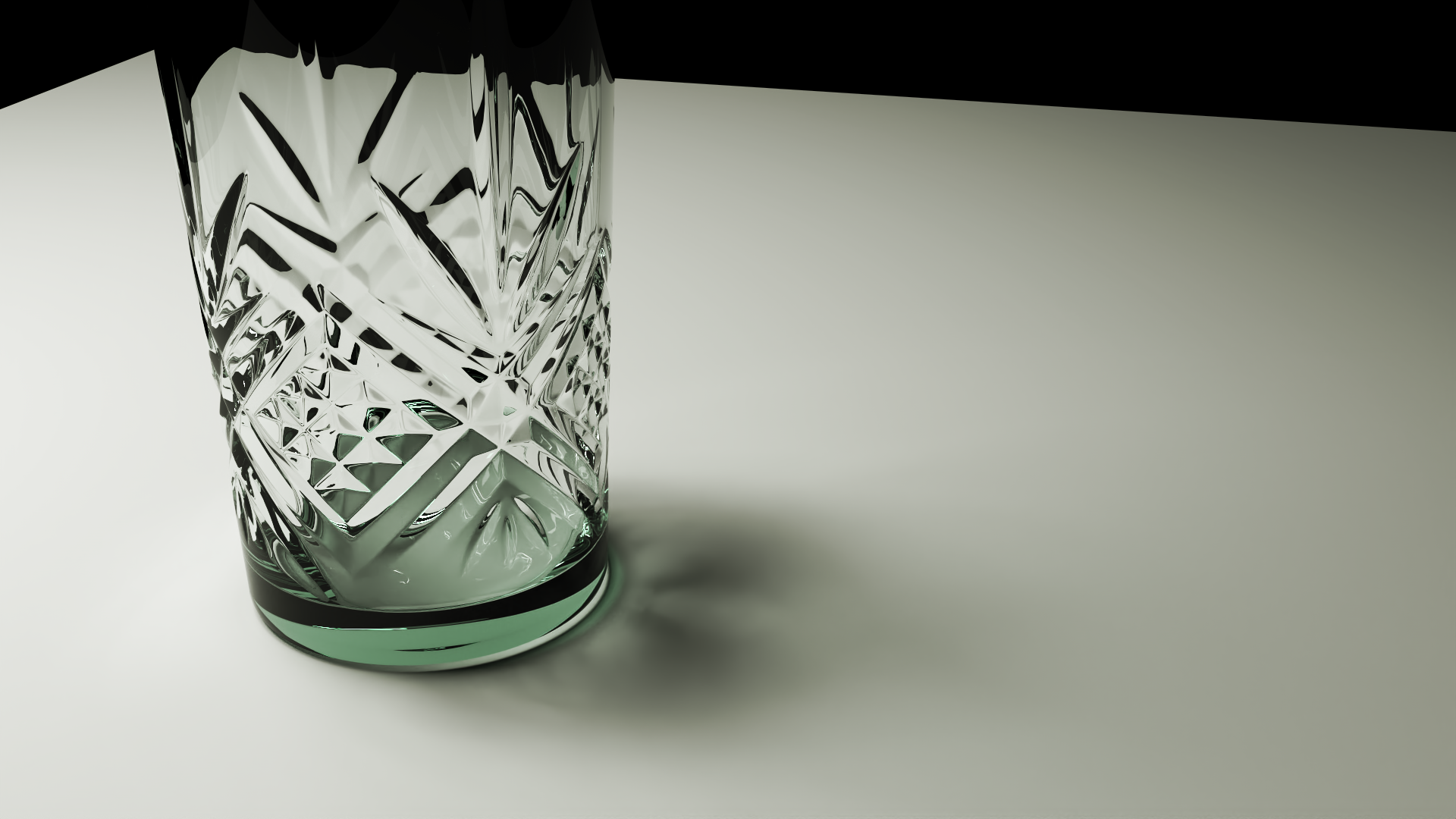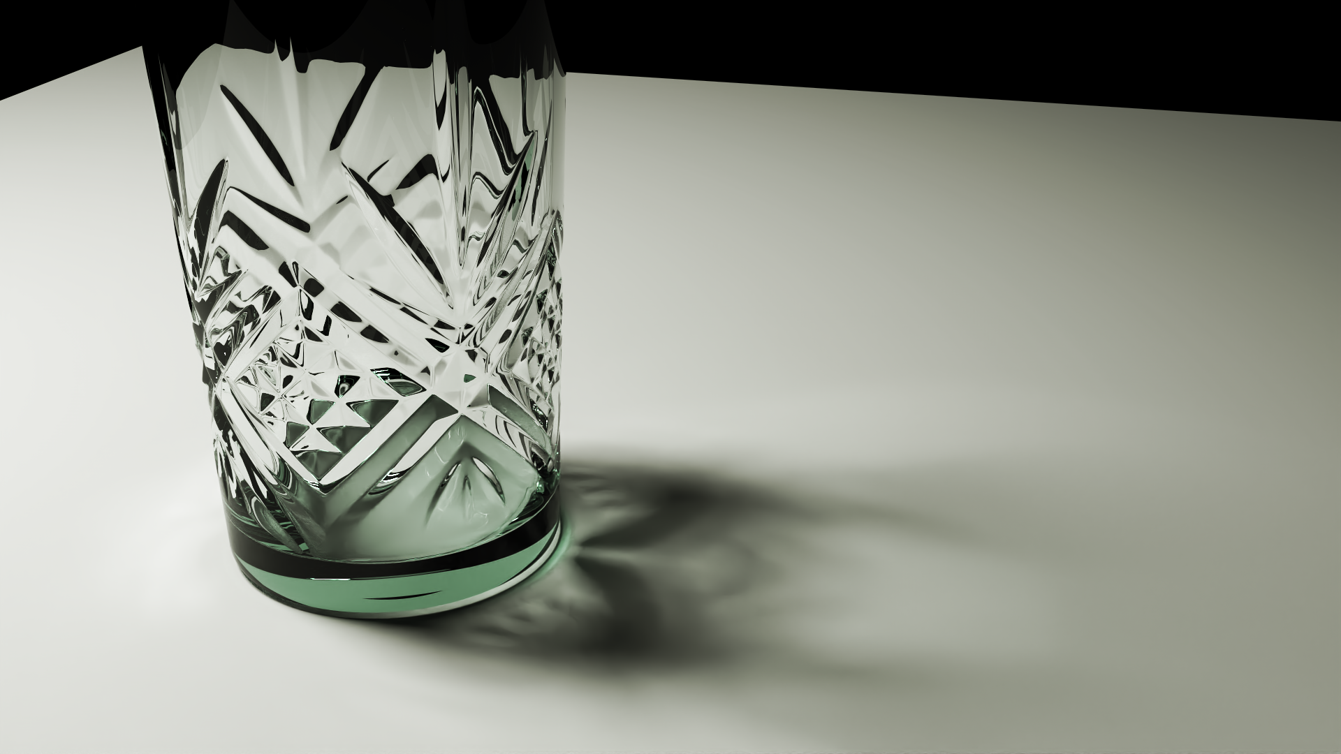 Es un vaso difuminado por el dof, creo que con una cámara real a esa distancia es difícil enfocar bien, ningún color o pintura podría etiquetarse como "vidrio transparente". El color del vidrio está determinado por lo que lo rodea, lo que se ve a través de él, lo que se refleja en él y la cantidad de sombra que hay. El tallado del vidrio se refleja en esa zona así, es correcto físicamente.
