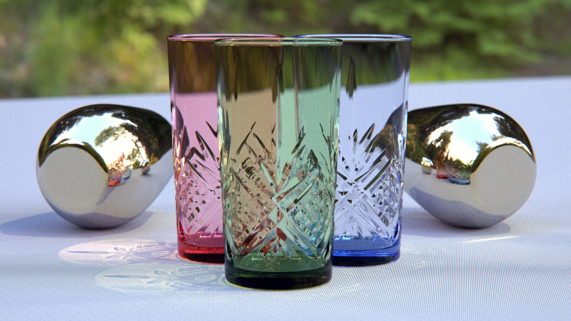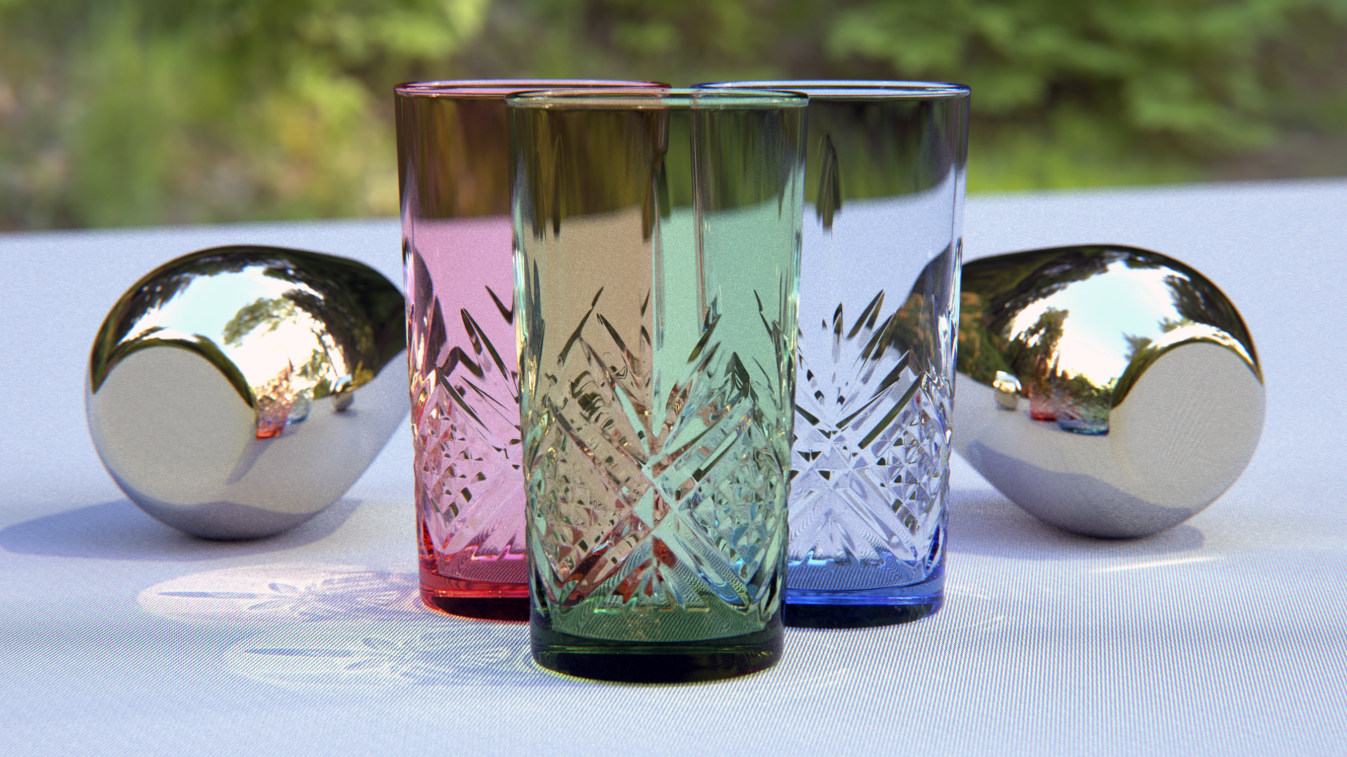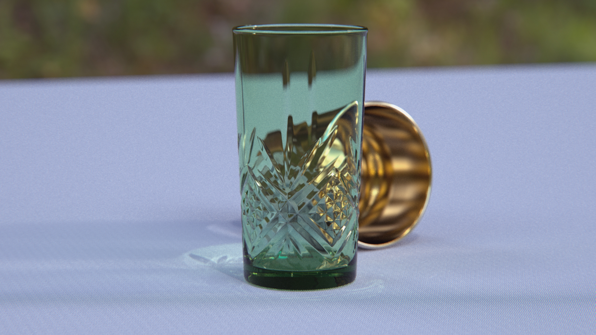 Es un vaso difuminado por el dof, creo que con una cámara real a esa distancia es difícil enfocar bien, ningún color o pintura podría etiquetarse como "vidrio transparente". El color del vidrio está determinado por lo que lo rodea, lo que se ve a través de él, lo que se refleja en él y la cantidad de sombra que hay. El tallado del vidrio se refleja en esa zona así, es correcto físicamente.